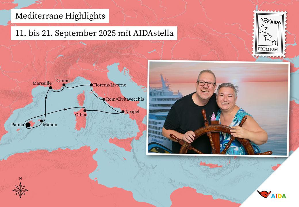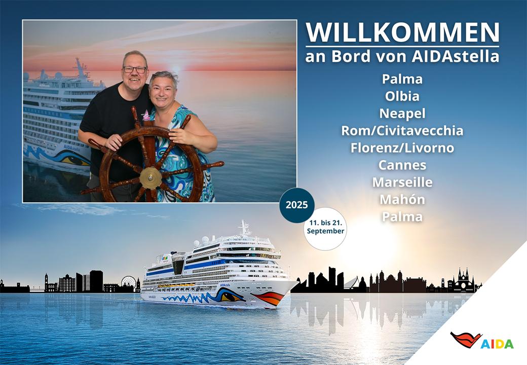Unser heutiger Tag: Heute starten wir zu unserer AIDA-Tour „Mediterrane Highlights“. Wir fliegen nach Palma de Mallorca und checken auf AIDAstella ein. Den restlichen Tag genießen wir die Annehmlichkeiten des Schiffes 🙂