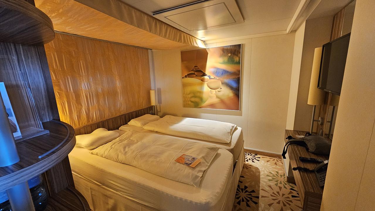 In der Kabine auf Deck 6 angekommen, sind wir erst mal überrascht. Zum ersten Mal haben wir eine Meerblick-Kabine mit eingeschränkter Sicht gebucht. Diese ist „quer“ aufgebaut, das bedeutet, das Fenster liegt direkt gegenüber vom Eingang, das Bett befindet sich links in einem „Nebenraum“. Echt kuschelig, gefällt uns sehr gut!