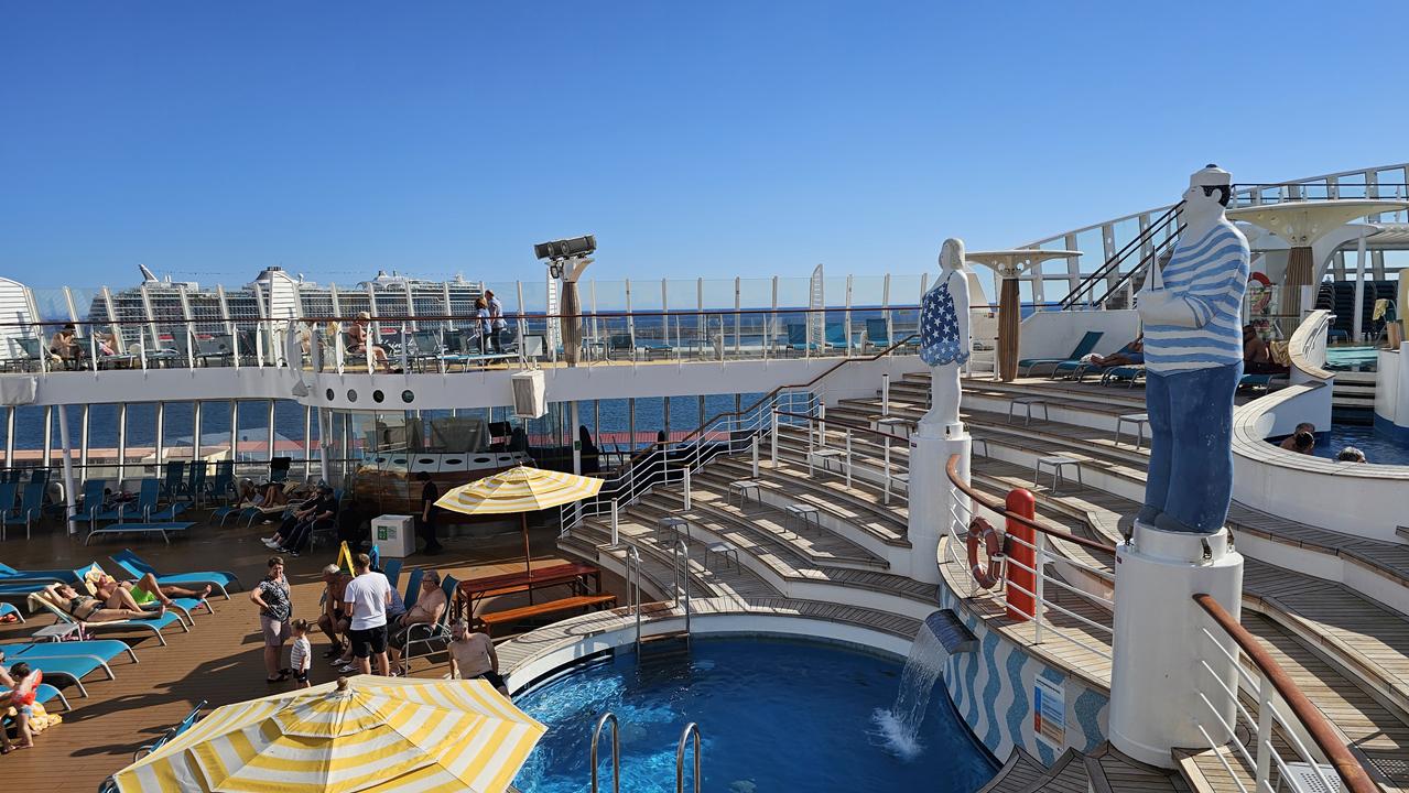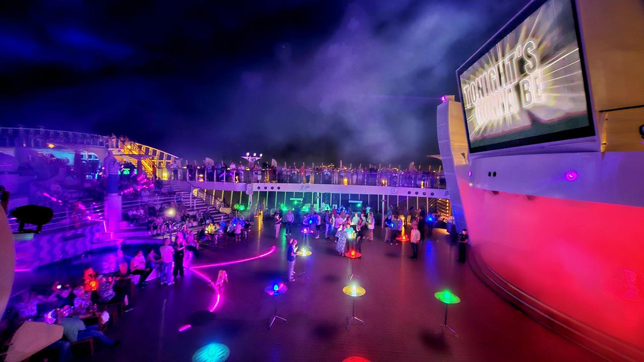 Die Stimmung auf dem Pooldeck ist super. Eine Reise startet natürlich mit dem inoffiziellen Clubtanz dem El Tiburon – Astrid stürmt die Tanzfläche, bei dem Tanz ist sie einfach nicht zu halten 😁
