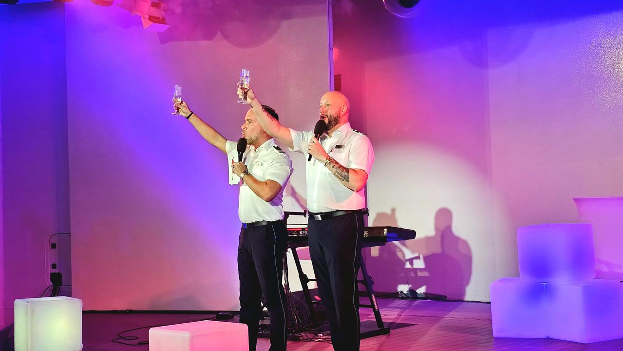 Die Abfahrt verschiebt sich auf 22:30 Uhr aufgrund eines verspäteten Fliegers. Aber dann geht es los und unsere Kreuzfahrt kann beginnen. Die berühmten drei Wörter von unserem Hoteldirektor und unserem Entertainmentmanager Chris geben den Startschuss: “ Sie haben Urlaub!“