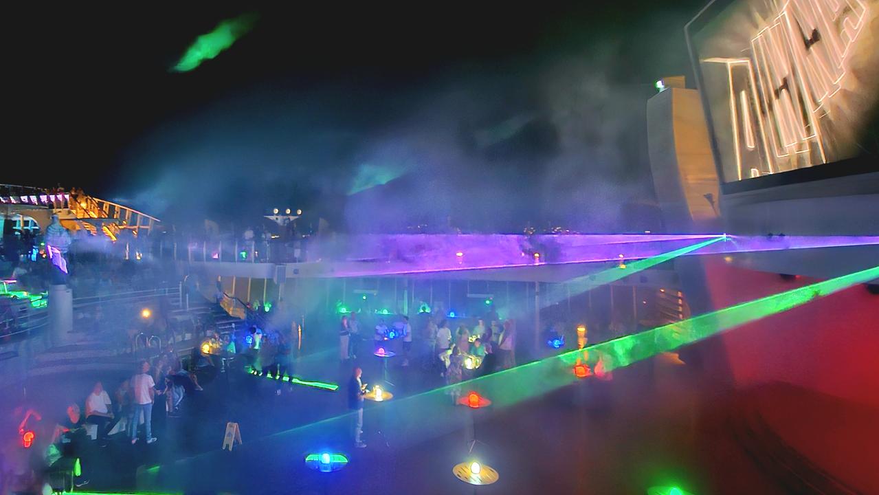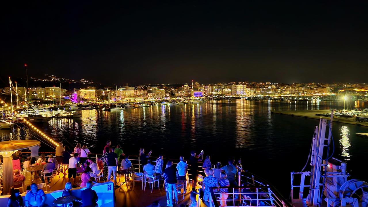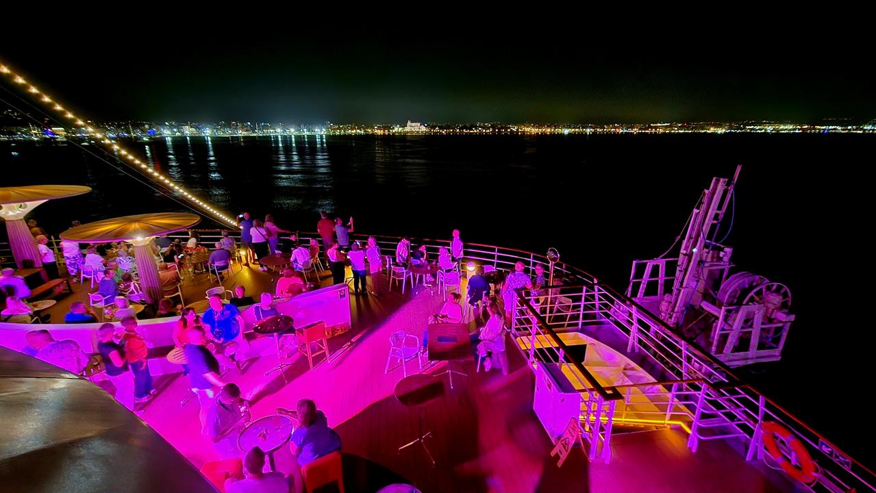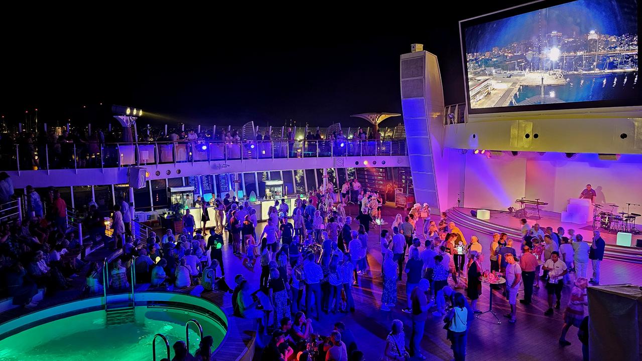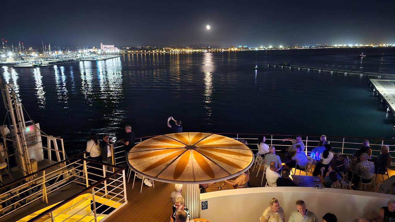Die Welcome-Poolparty beginnt um 21:15 Uhr auf dem Pooldeck, begleitet von der Band Soprano. Ein laues Lüftchen, mildes Klima, tolle Musik… und das zu der fantastisch beleuchteten Kulisse von Palma. Einfach herrlich!