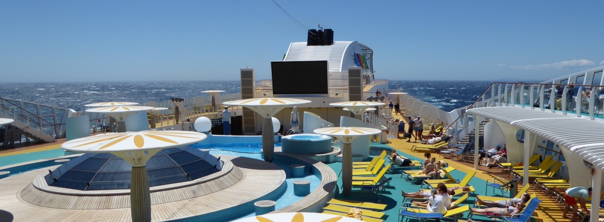 Wir machen uns schnell fertig und gehen ins Bella Donna zum Frühstück. Es ist wohl bei vielen gestern spät geworden . Das Restaurant und das Pooldeck sind noch relativ leer. Wir suchen uns einen sonnigen Platz auf Deck 11 und lesen.