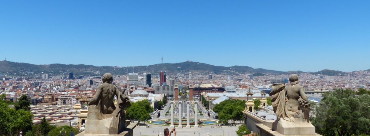 Was uns fasziniert, ist der Glasaufzug der an der Außenfassade der Arena. Dieser führt auf das Dach der Arena. Der Spaß kostet uns nur 1 Euro pro Person. Echt cool! Von dort oben genießen wir eine 360 Grad Panoramaaussicht auf die Stadt – und insbesondere auf den Place de Espanya, die Türme, den Brunnen und das Nationalmuseum.