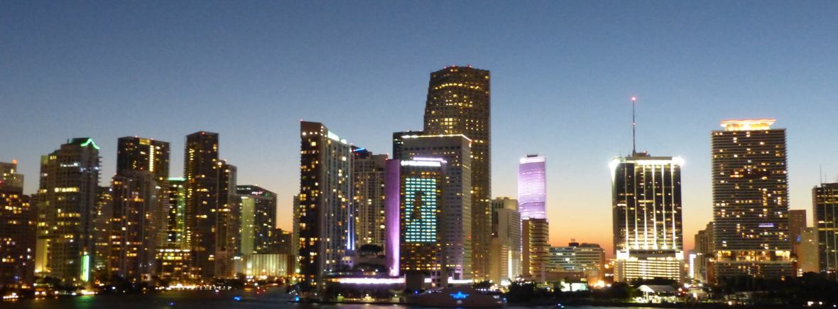 Das Einchecken haben wir nach 5 Minuten erledigt. Jetzt nur noch das Willkommensfoto und wir können an Bord. Kurz auf das oberste Deck und die „blaue Stunde“ nutzen. Ein grandioses Panorama der Skyline von Downtown Miami liegt vor uns.