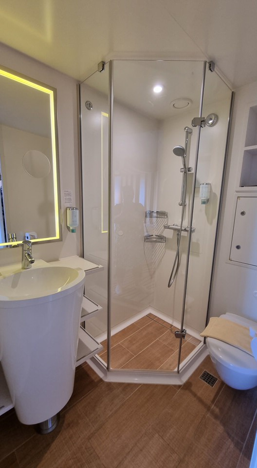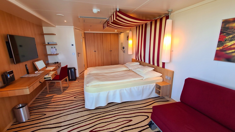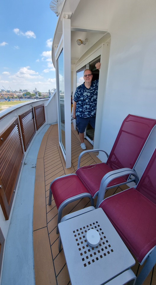 Alles in allem haben wir nur 35 Minuten gebraucht vom Anstellen zur Kofferabgabe bis zum Öffnen der Kabinentür (9104). Unsere Balkonkabine liegt in Front des Schiffes, also ganz vorne am Bug 🙂 und wir haben einen genialen Blick!