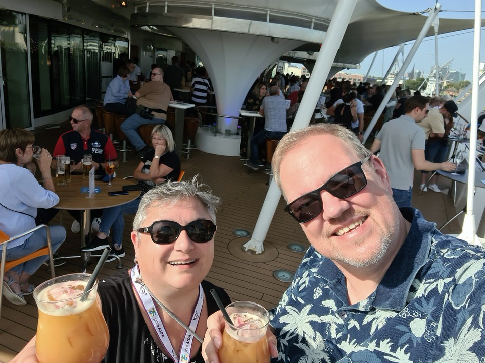 Um 18:00 Uhr laufen wir aus. So war es geplant – entsprechend früher waren wir an der Lanai Bar auf Deck 7, hinten am Heck. Allerdings verzögert sich das Ablegen um 20 Minuten. Der „Cocktail of the day“ schmeckt trotzdem super lecker.