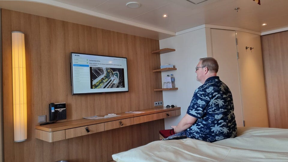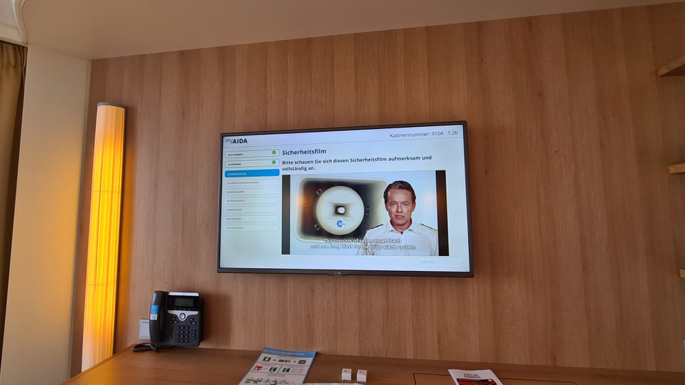 Wie funktioniert denn die Sicherheitseinweisung? Ganz einfach! Der Sicherheitsfilm wird über den Fernseher geschaut. Alternativ auch über das Smartphone. Das Menue führt durch den Prozess. Nach dem Bestätigen, dass wir den Film geschaut haben, haben wir 17:00 Uhr Zeit mit unserer Rettungsweste an unsere Musterstation zu gehen und uns dort registrieren zu lassen. Unsere Musterstation ist diesmal Station A und liegt an der Nightfly Bar. Das war es dann auch schon – wirklich sehr easy.