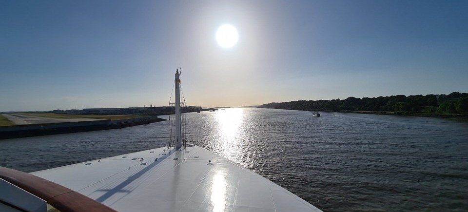 Anschließend genießen wir die Fahrt auf der Elbe vom Balkon unserer Kabine aus. Was für eine tolle Aussicht!