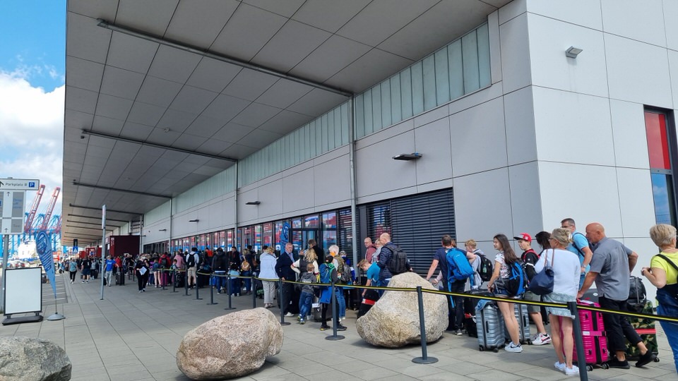 Zuerst werden die Koffer abgegeben. Wir stellen uns in die erste Schlange um 11:30 Uhr an. Um 11:45 Uhr sind die Koffer abgegeben und wir gehen zur zweiten Warteschlange. Mitarbeiter von Aida fragen jeden nach seiner Check in Zeit und siehe da: Die meisten sind viel zu früh und dürfen noch nicht durch. Und wir werden an allen vorbei gelotst und können quasi durchgehen bis zum Check In.