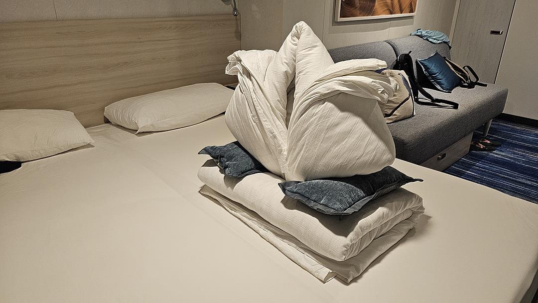 Gegen 16 Uhr treffen wir wieder am Schiff ein. Kurz auf der Kabine frischgemacht – und sich über die neue Deko auf dem Bett gefreut. 🙂 Und dann ab aufs Pooldeck ins Bar & Grill Außenalster. Hier treffen wir uns mit Ille und Karin. Gemeinsam lassen wir bei einem Cocktail und ein paar Snacks den Tag Revue passieren.
