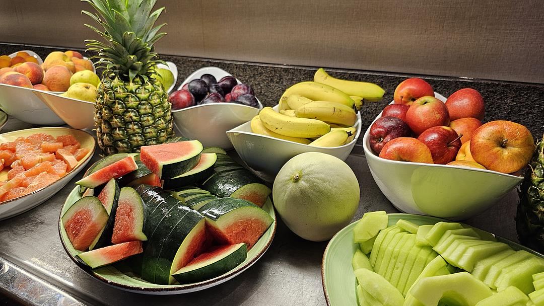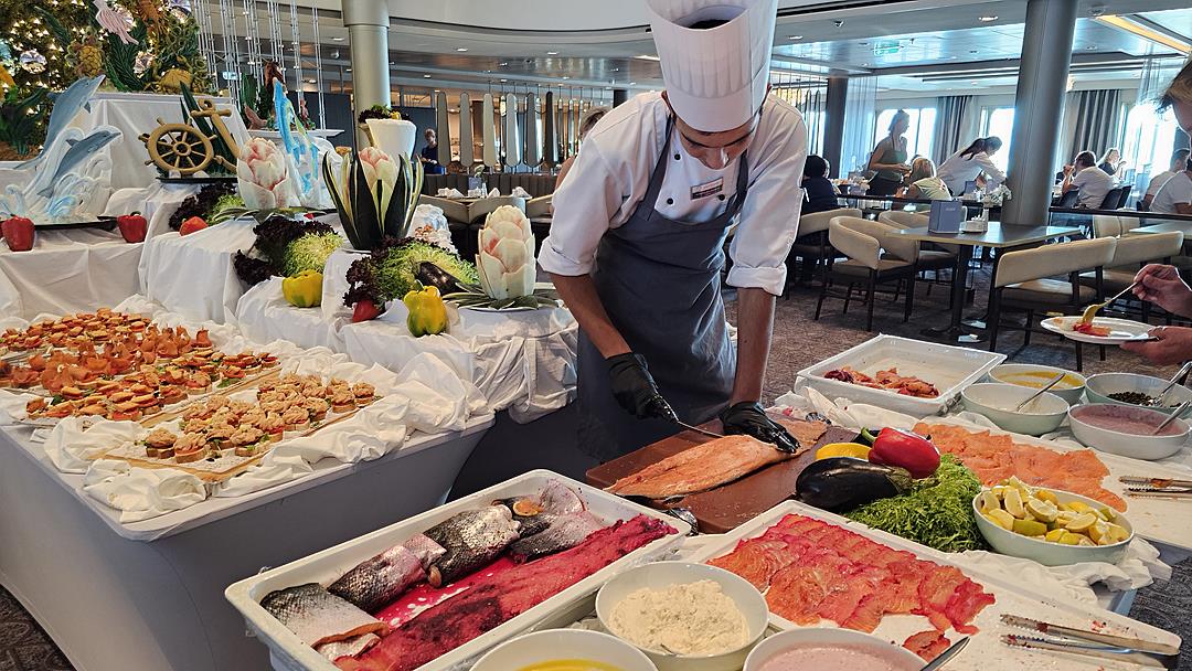 Es stehen mehrere Restaurants zur Verfügung, die Frühstück anbieten. Immer nachzulesen in der täglichen Bordzeitung. Wir entscheiden uns für das Atlantik Klassik auf Deck 3. Heute gibt es sogar zusätzlich zu normalen Buffet-Frühstück ein Lachs-Buffet mit frisch aufgeschnittenem Lachs.