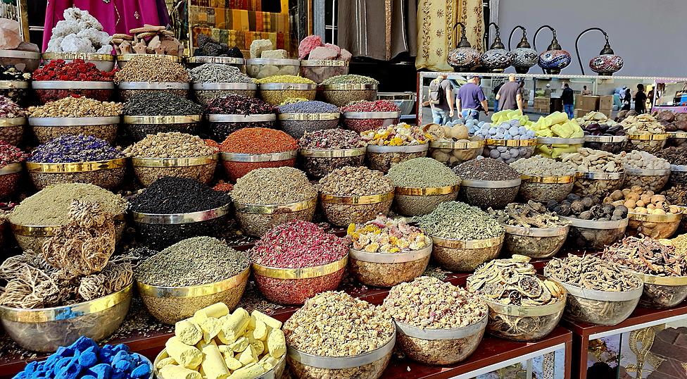In Deira angekommen ist beim Aussteigen aus dem Wassertaxi bereits der berühmte Gewürzsouk zu sehen. Man erkennt den Markt aber auch am betörenden Geruch, den die Gewürze, frisch aus aller Welt, in übergrosse Tüten verpackt, verströmen.