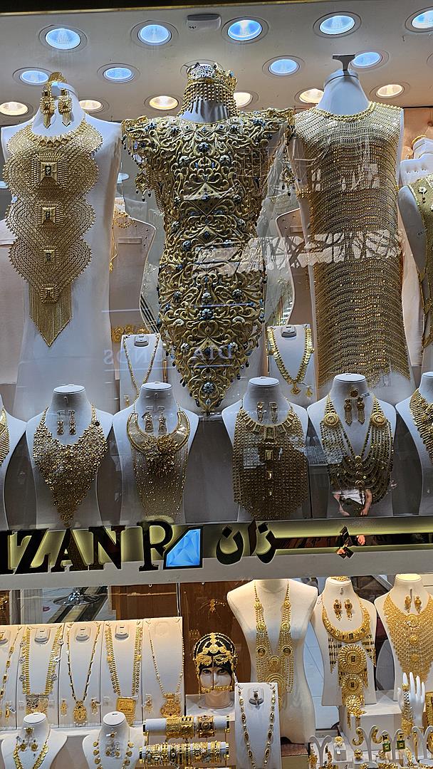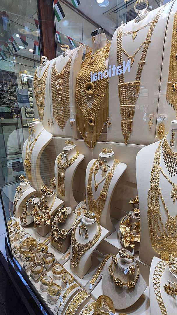 Soviel Prunk und Glamour – Wahnsinn! Funkelnde Schaufenster mit luxuriös-goldenen Ringen aus Gold, Ketten aus Gold oder Armreifen aus Gold zieren das Bild der überdachten Einkaufsstraße. Übrigens: Im gesamten Goldsouk in Dubai wird nur echte und hochwertige Ware angeboten. Die Regierung überwacht permanent die Echtheit und Qualität und Echtheit der angebotenen Waren.