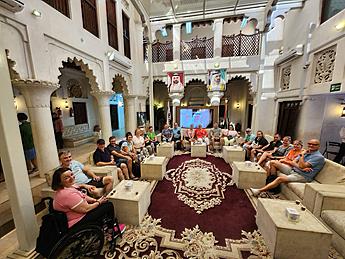 Mohamed wartet schon am Treffpunkt, begrüßt uns ganz herzlich und weist uns den Weg zum Bus. Unsere Gruppe ist 18 Mann stark und wir haben einen großen Bus! Viel Platz für jeden von uns, sehr gut! Lustigerweise treffen wir hier Ille und Karin wieder, die beiden haben wir gestern auf unserer abendlichen Dhaufahrt kennengelernt. Das freut uns sehr!