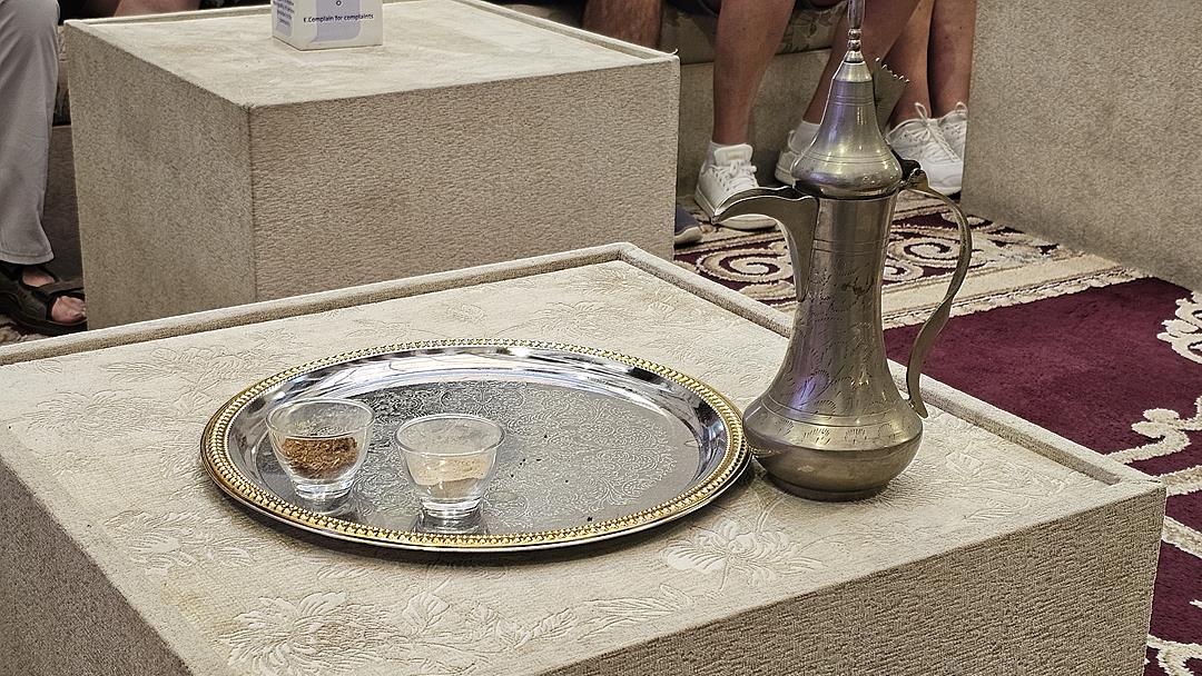 Mohamed führt uns in einen wunderschön verzierten Innenhof. Dort bekommen wir traditionellen schwarzen Tee serviert, aus einer Teekanne die wie Aladins Wunderlampe aussieht 🙂 Ehrfürchtig folgen wir den Ausführungen unseres Tourguides. Wir fühlen uns wie aus 1000 und einer Nacht!