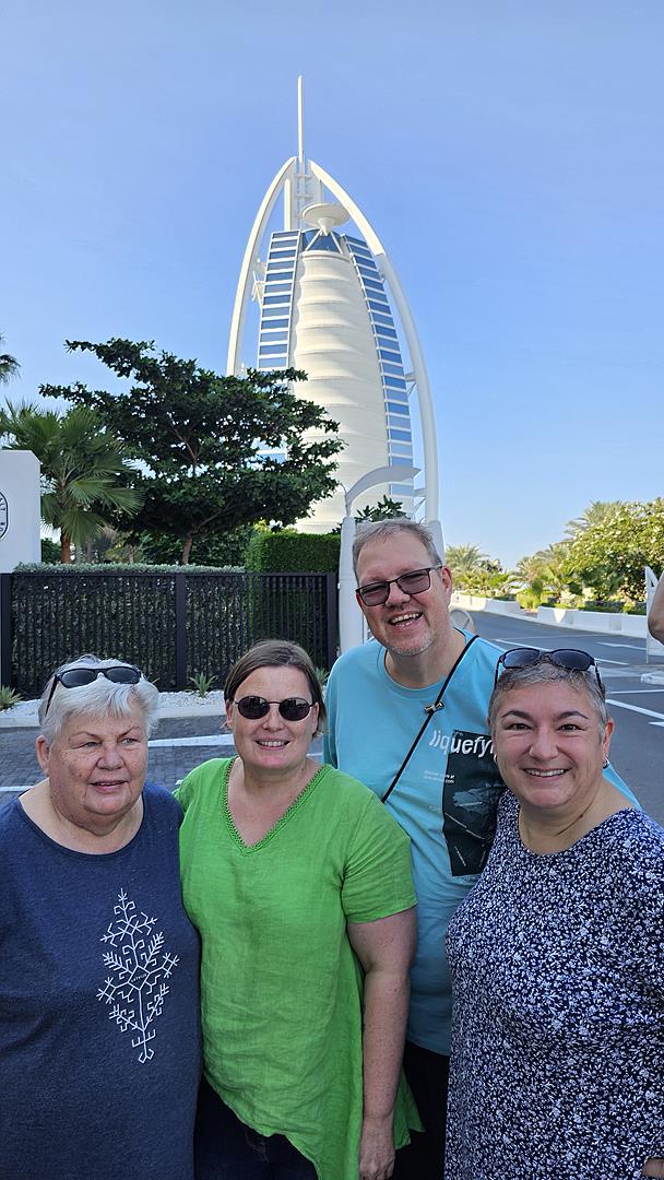 Auch alle anderen aus unserer Gruppe sind pünktlich von ihrer Turm-Besteigung zurück und weiter geht unsere Tour. Ein Fotostopp am Burj al Arab, dem 7-Sterne-Hotel von Dubai, steht an.