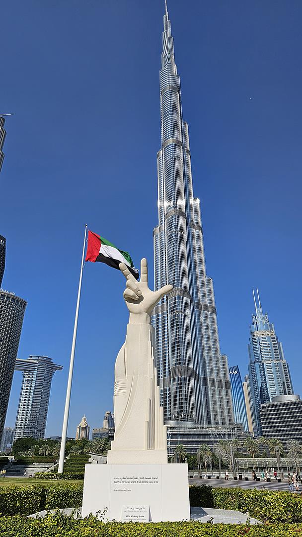 Neu ist eine Skulptur mit dem Drei-Finger-Gruß. Diese Geste wurde durch Seine Hoheit Scheich Mohammed bin Rashid Al Maktoum, dem Vizepräsidenten und Premierminister der VAE und Herrscher von Dubai, bekannt. An immer mehr Orten in Dubai wird diese Handgeste in Form von Skulpturen aufgestellt. Sie bedeutet: W für „win“ (gewinnen), V für „victory“ (Sieg) und L für „love“ (Liebe).