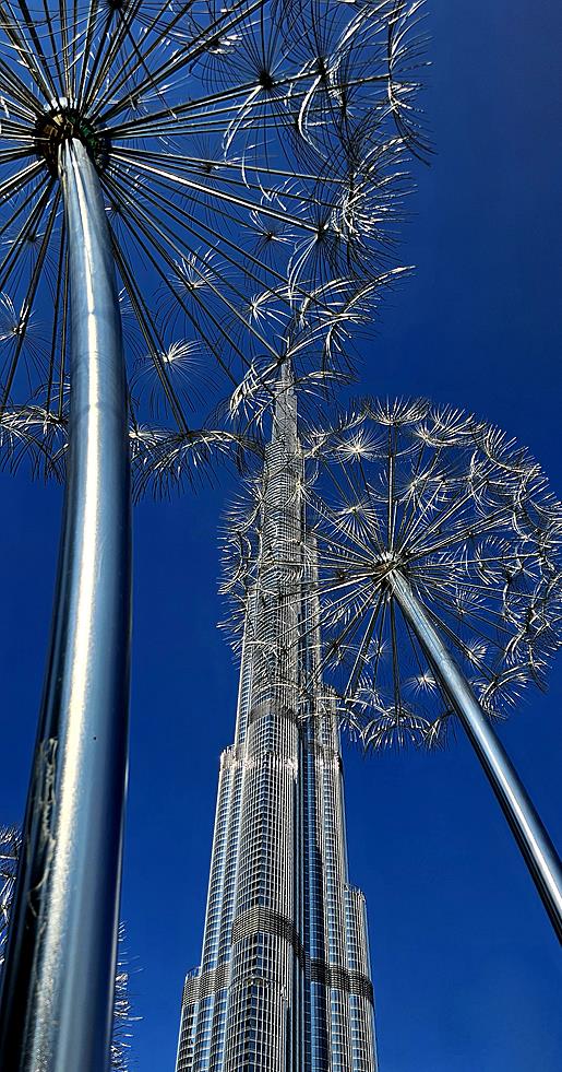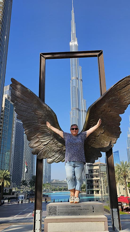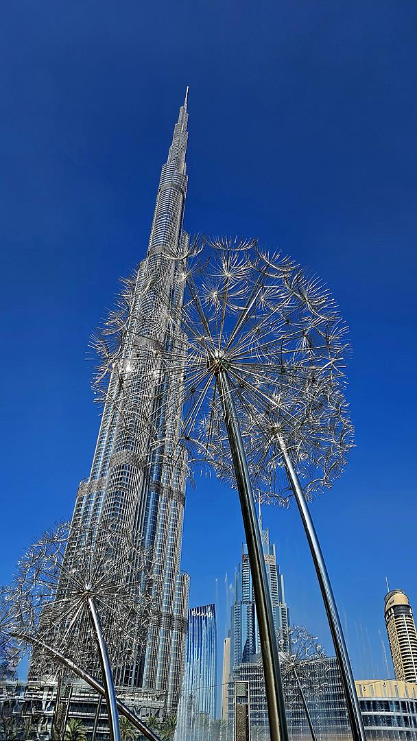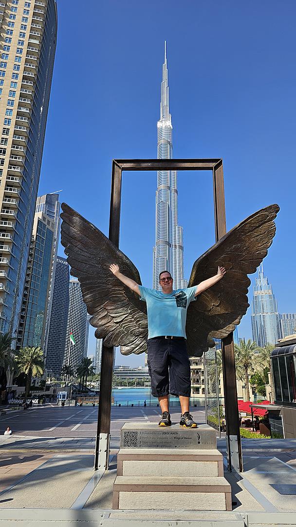Wir umrunden weiter den See und biegen ab auf den Burj Plaza, der etwas weiter von der Dubai Mall entfernt liegt. Hier befindet sich die Skulptur „Wings of Mexico“. Das Kunstwerk besteht aus einem riesigen Paar Bronzeflügeln mit einem Rahmen, der den Burj Khalifa im Hintergrund perfekt einrahmt.