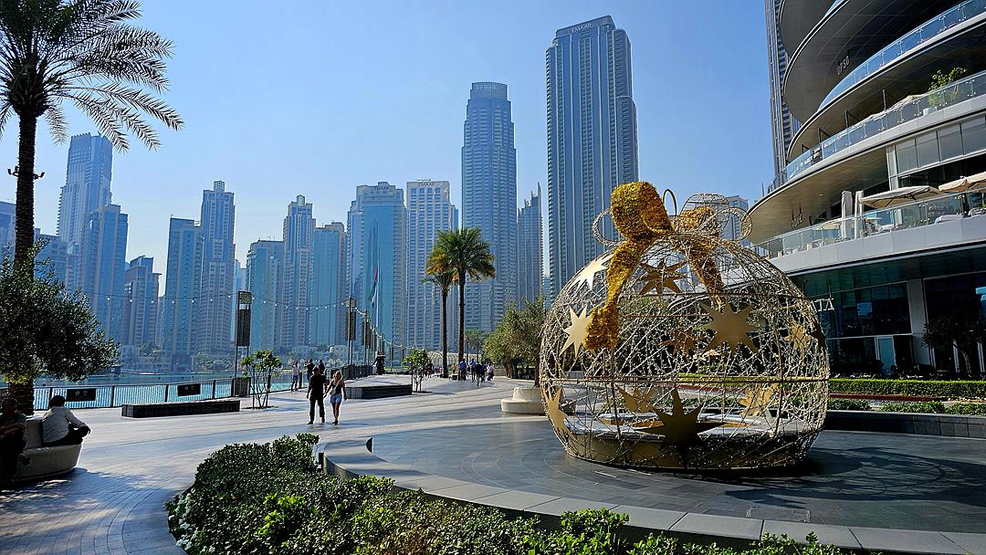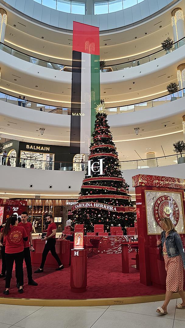 Wir haben nun 1,5 Stunden Zeit die Umgebung zu erkunden. Uns zieht es nach draußen, zum Wasserbecken, in dem ab 18 Uhr die berühmten Wasserspiele stattfinden. Wir wollen einmal um den See herum spazieren und hoffen, ein paar schöne Fotos mit dem Burj machen zu können. Überall ist es weihnachtlich festlich geschmückt. Das sieht am Abend, wenn es beleuchtet ist sicher wunderschön aus. Aber auch jetzt bei Tageslicht wirkt das einfach herrlich.
