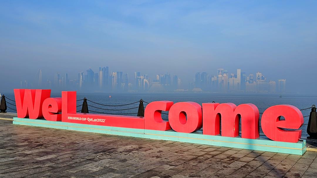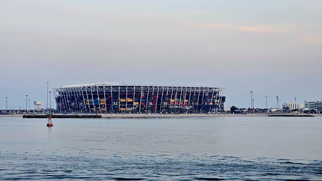 Doha in der Dämmerung ist ein besonderes Erlebnis. Auf der Dhau ergattern wir auf dem Oberdeck einen tollen Platz und kuscheln uns in unsere Sitzkissen. Wir starten unsere Entdeckungsfahrt entlang der Küste Dohas. Vorbei am 974-Stadion. Ein Fußball-Stadion mit rund 44.000 Plätzen, das extra für die Weltmeisterschaft 2022 aus 974 bunt angeordneten Schiffscontainern gebaut wurde. 974 deshalb, weil die internationale Ländervorwahl von Katar +974 ist. Verrückt, nicht? Das Stadion wird allerdings nun wieder abgebaut, auf dem riesigen Gelände sollen Freizeit- und Grünanlagen entstehen.