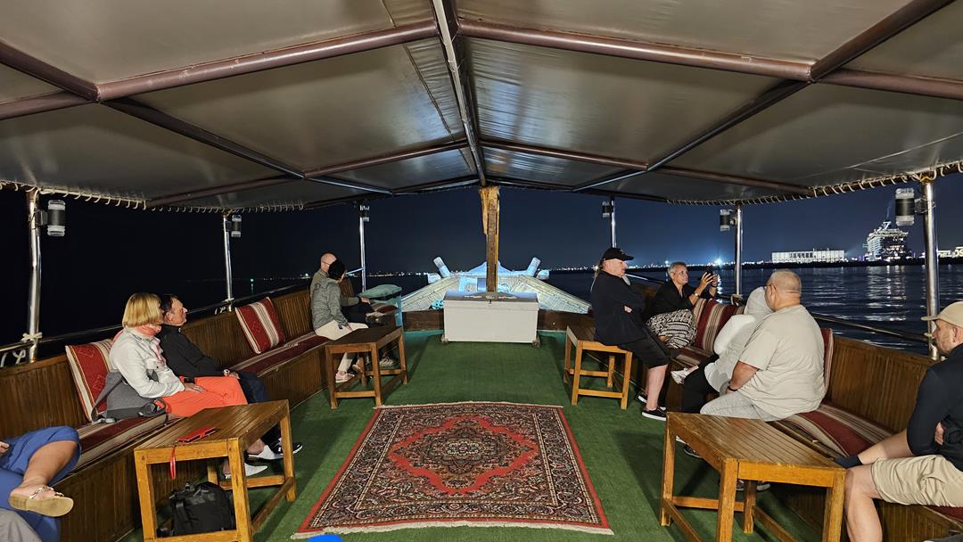 Der Ausflug „Abendliche Dhaufahrt“ über die Reederei Mein Schiff war im Ursprung auf 19 Uhr geplant. Während der Reise haben wir den Bescheid bekommen, dass er auf 16 Uhr vorverlegt wird. Komisch, haben wir erst gedacht. Wieso 16 Uhr? Es soll doch „abendlich“ sein…. Aber wir stellen fest: Der Sonnenuntergang ist auf 16:44 Uhr angekündigt. Also passt das ja doch mit dem „abendlich“ 😉 Übrigens haben sich unsere Reisebekannten Ille und Karin dem Ausflug angeschlossen. Wir freuen uns darüber, gemeinsam ziehen wir los.