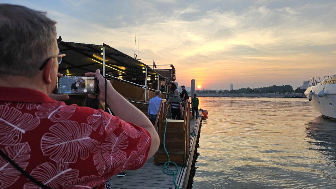 Besonders stimmungsvoll ist eine Fahrt am Abend. Beim Ablegen werfen wir einen Blick zurück zum Sonnenuntergang hinter der Fanar-Moschee. Wunderschön!