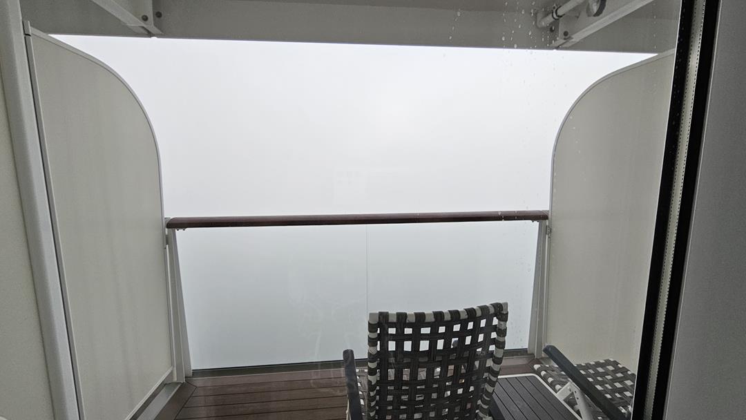 Schon halb acht laufen wir los. Der vereinbarte Treffpunkt ist das rote „Welcome-Schild“, ein paar hundert Meter vom Hafenterminal entfernt. Den Treffpunkt kennen wir schon von gestern 🙂 Der Nebel ist ein wenig durchlässiger geworden, der blaue Himmel scheint langsam durch.