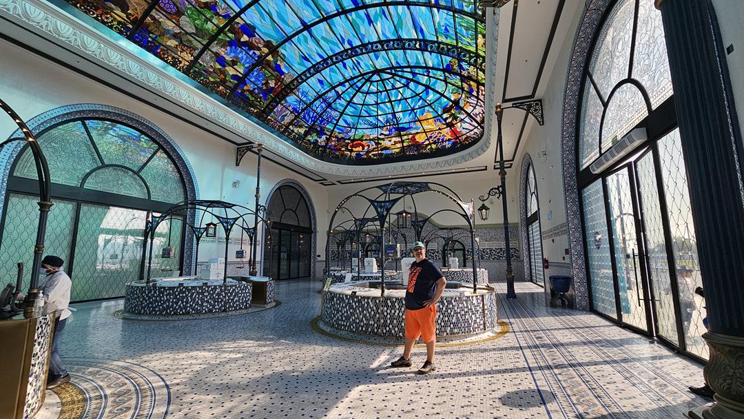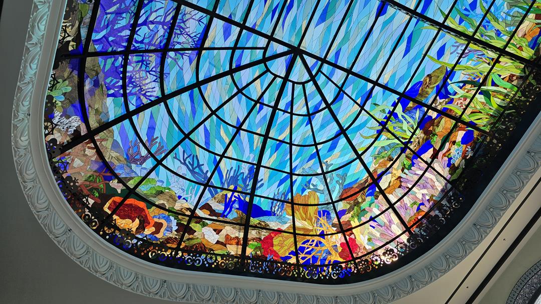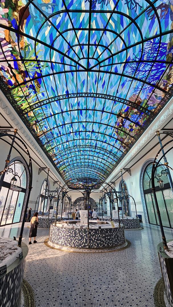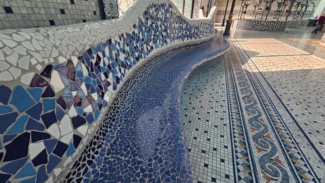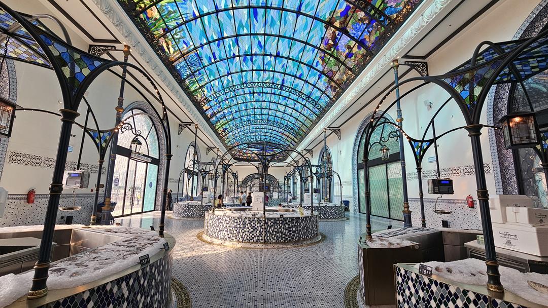 Die Fischhalle glänzt mit einem atemberaubenden Design. Überall herrliche Mosaiken, das Meeres-Glasdach erzeugt eine faszinierendes Licht. Die von den ruhigen Blautönen des Meeres inspirierte Architektur strahlt tiefgehende Ruhe aus.