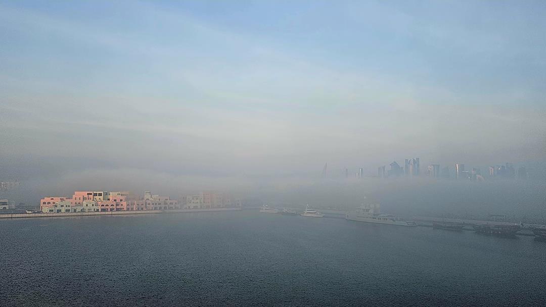 Guten Morgen aus Doha! Unser zweiter Tag in Katar! In aller Frühe stehen wir auf, denn schon um 8 Uhr startet unsere Tour in die Wüste. Oh Mann, ist das früh – 6 Uhr! Und der Blick vom Balkon überrascht: Gestern war da noch die City von Doha. Und heute morgen? Nichts als weißer Nebel…. Der Sonnenaufgang ist für 6:07 Uhr angekündigt. Und ja, es wird irgendwie hell, aber der Nebel hebt sich nur ganz langsam. Ein klein wenig können wir die Skyline nun durchscheinen sehen 🙂