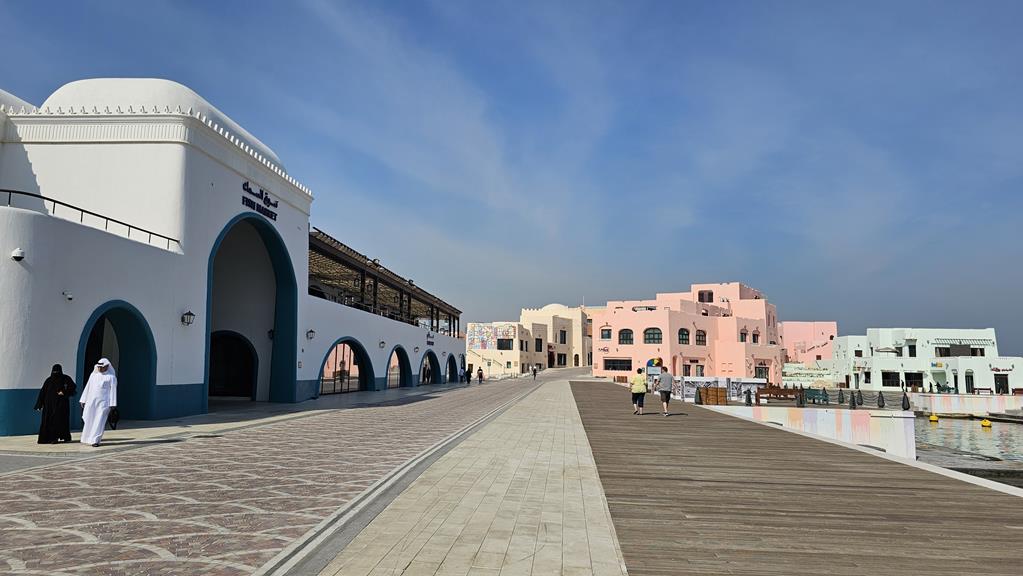 Viertel nach zwölf sind wir wieder zurück. Wie vereinbart lässt uns unser Fahrer an der Halle des Fischmarktes raus. Wir verabschieden uns mit einem guten Trinkgeld von ihm und stehen mitten im Mina Distrikt. Dieser District liegt unweit des Schiffes und wir haben ihn bereits vom Schiff aus gesehen: Eine Ansammlung bunter, farbenfroher Gebäude am alten Hafen von Doha.