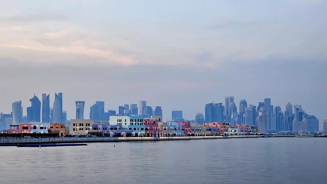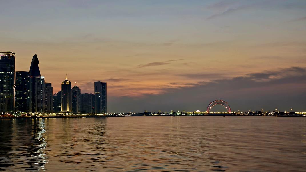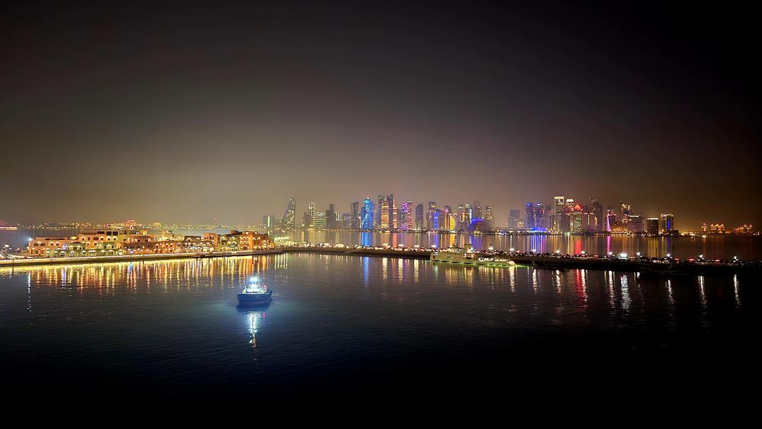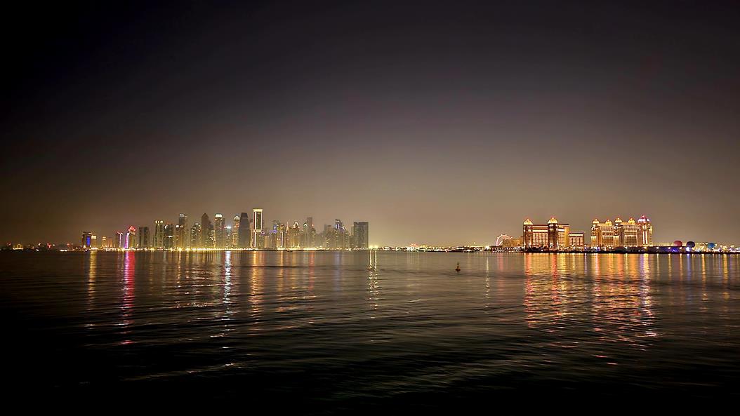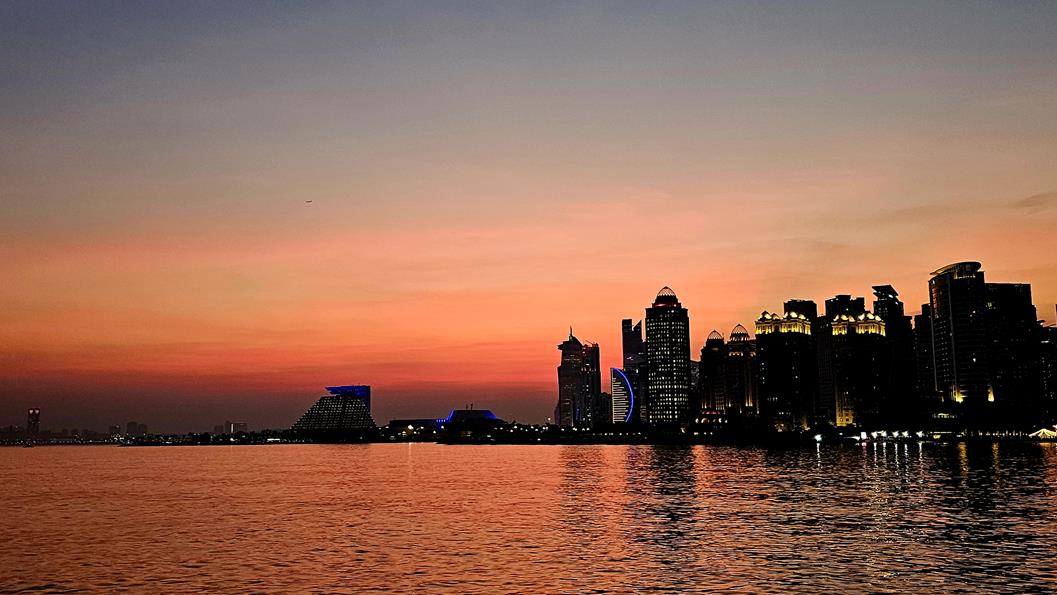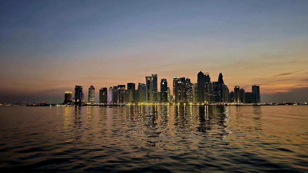 So langsam wechselt die Atmosphäre, die blaue Stunde beginnt. Die beeindruckende Skyline von Doha liegt vor uns, einschließlich der besonderen Wolkenkratzer in der West Bay, wie den Tornado Tower und den Doha Tower.