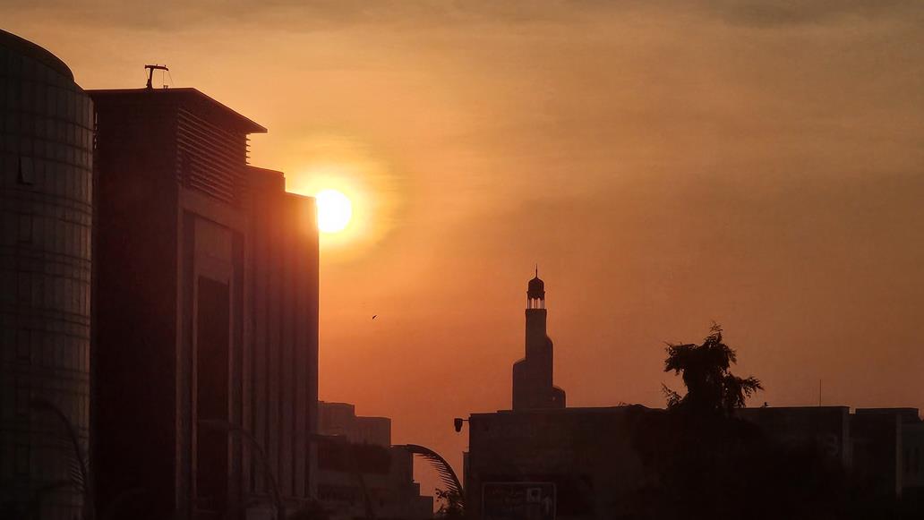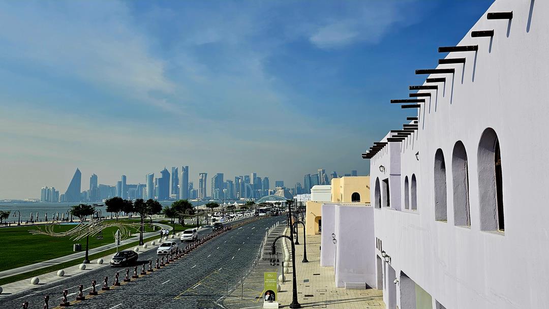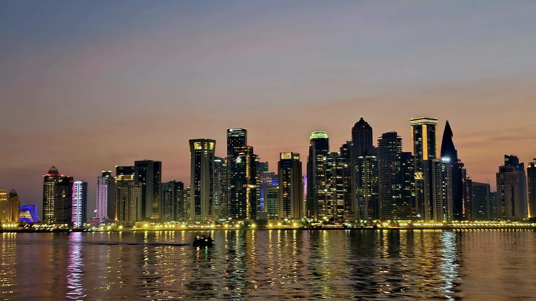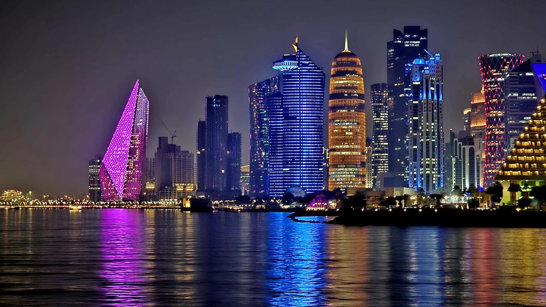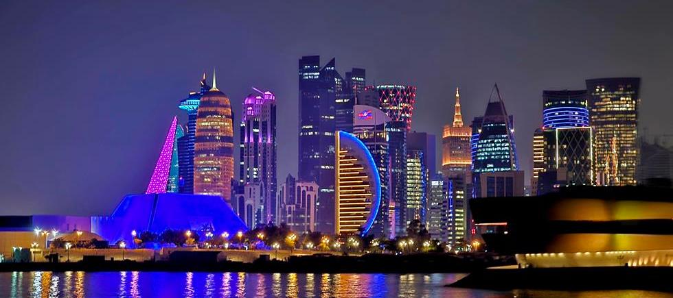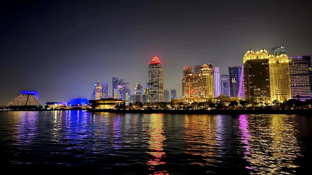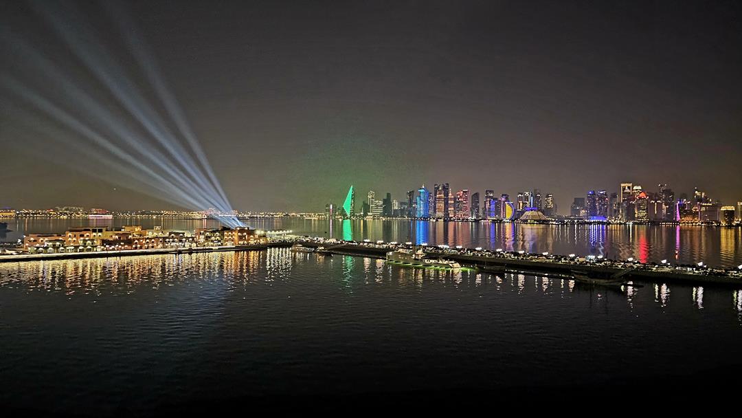 So langsam wechselt die Atmosphäre, die blaue Stunde beginnt. Die beeindruckende Skyline von Doha liegt vor uns, einschließlich der besonderen Wolkenkratzer in der West Bay, wie den Tornado Tower und den Doha Tower.