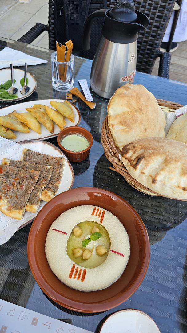 Genau hier – mit diesem Blick auf die Mein Schiff – suchen wir uns ein gemütliches Speiselokal mit Außenterrasse. Denn so langsam meldet sich der Hunger, wir haben ja heute morgen das Frühstück ausfallen lassen. Wir entscheiden uns für orientalisch und stellen uns ein paar Vorspeisen zusammen, alles auf Empfehlung des Kellners. Alles ausgesprochen lecker, besonders das Hummus.