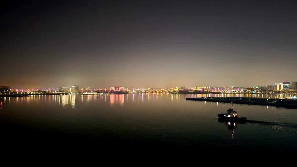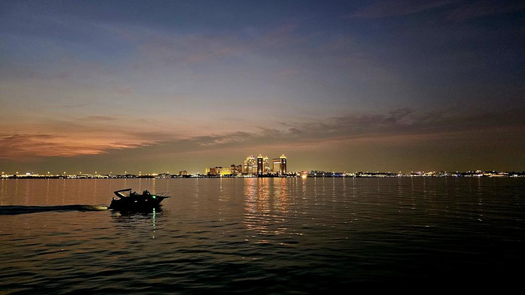 Das Lichtermeer der Hauptstadt Katars strahlt in seiner ganzen Pracht. Wir genießen die Stimmung mit den abendlichen Lichtern und bunt glitzerndem Wasser. Inzwischen haben wir The Pearl erreicht. Dies haben wir gestern bei Tageslicht gesehen. Bei Nacht und vom Wasser aus erleben wir ein ganz anderes stimmungsvolles Bild. Wunderschön!