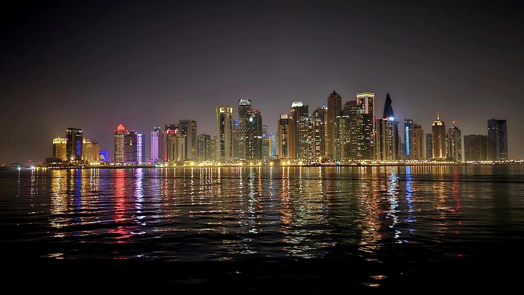 Besonderes Highlight: Unsere Dhau fährt ganz nah an der Skyline von West Bay vorbei. Die bunte Beleuchtung ist wirklich sagenhaft. Die Hochhäuser leuchten und glitzern und spiegeln sich im Wasser.