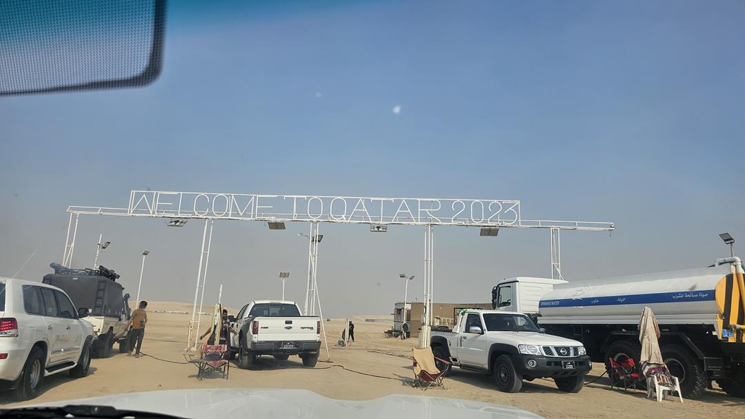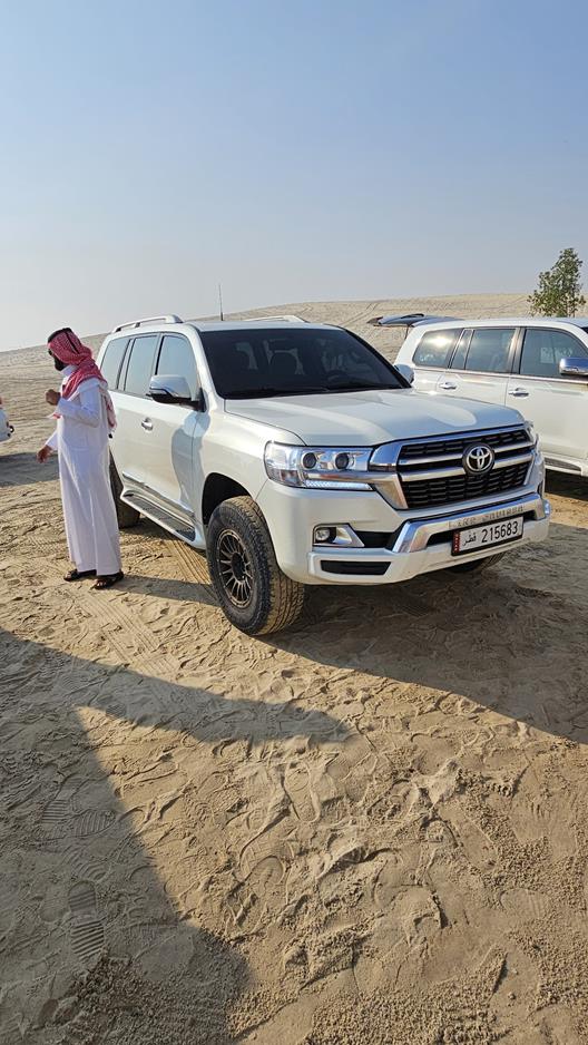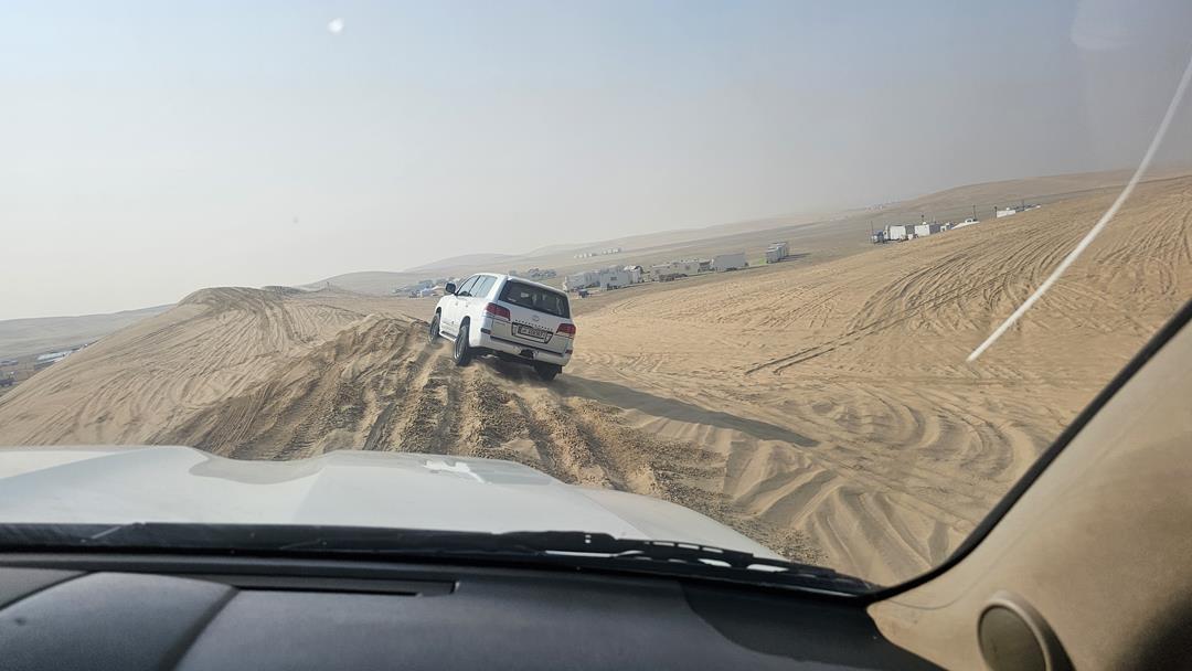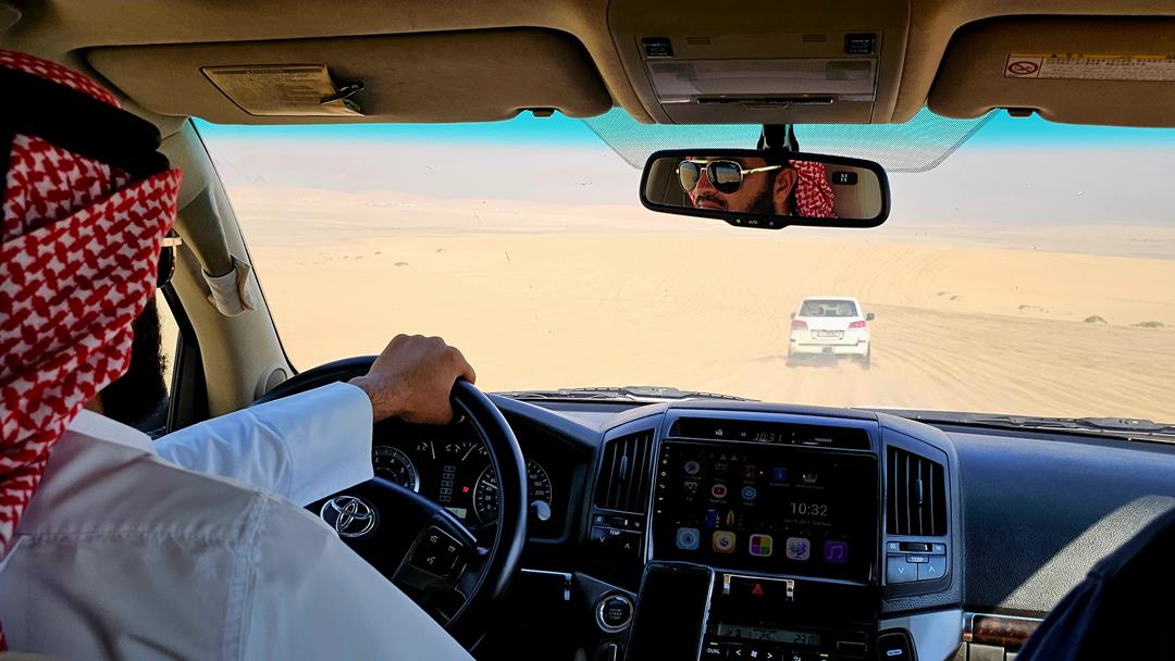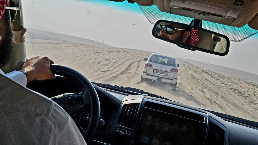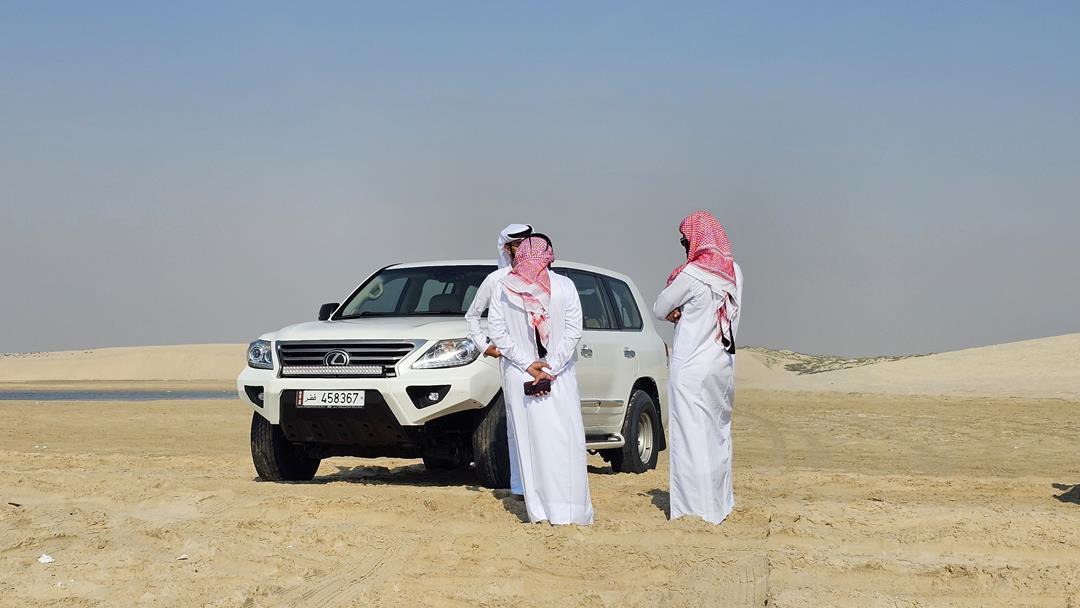 Kurz vor acht kommen drei große weiße Allrad-Jeeps angerauscht. Die Fahrer in traditioneller Katari-Kleidung, also mit langem weißen Gewand und rot-weißem-Kopftuch. Und natürlich mit cooler Sonnenbrille 🙂 Schnell werden die Jeeps unter den Wartenden aufgeteilt. Und das Beste: Wir haben einen Jeep für uns alleine!