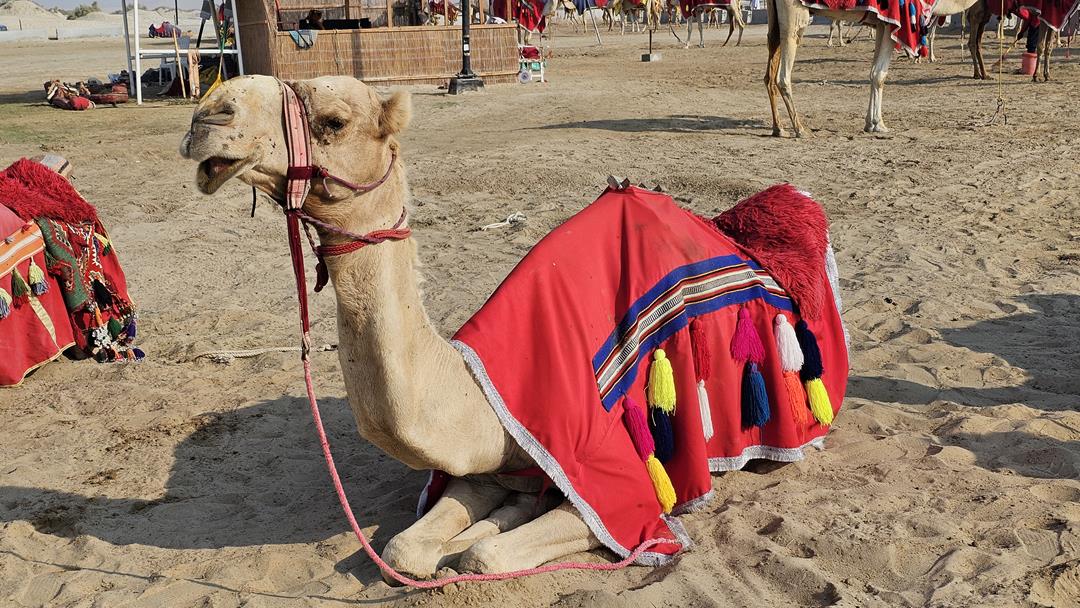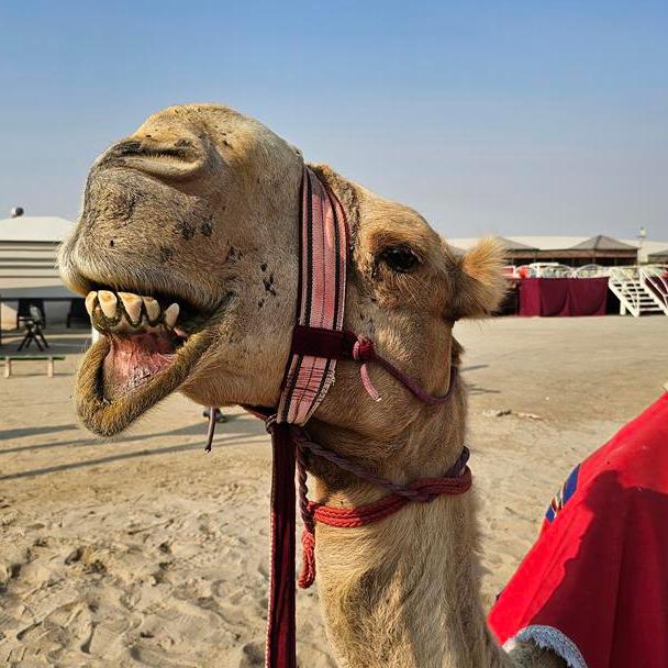 Der Ritt ist schon bald vorbei. Mein Kamel ruckelt wieder vor und zurück beim Hinlegen, wieder gut festhalten! Dann ist es geschafft. Wir rutschen aus dem Sattel und stehen wieder fest auf der Erde. Wir verabschieden uns von unserem Kamel, aber was ist das? Es lacht! Na ja, sieht eher aus, als ob es uns auslacht 😉