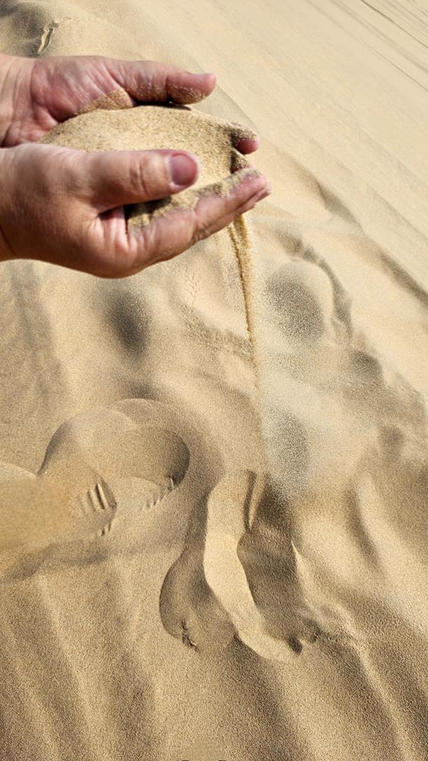 Der Sand ist weich und warm, er rinnt geschmeidig durch die Finger. Ganz feiner, hellgelber Wüstensand soweit das Auge reicht. Wenn man genau hinschaut, dann erkennt man, dass jedes Sandkorn ein ganz klein wenig andere Farbe hat.