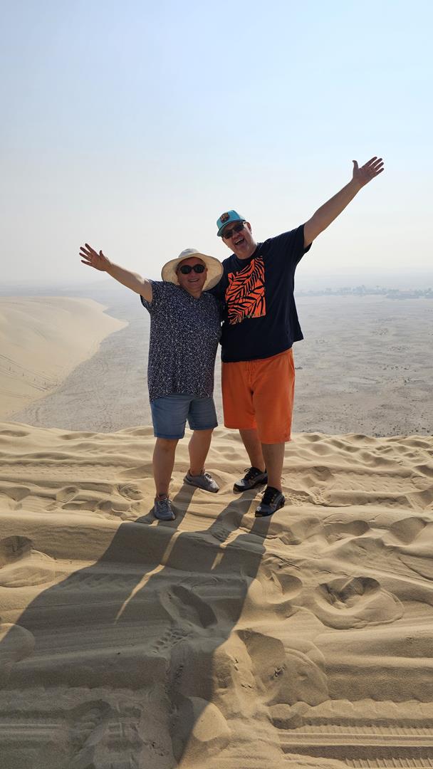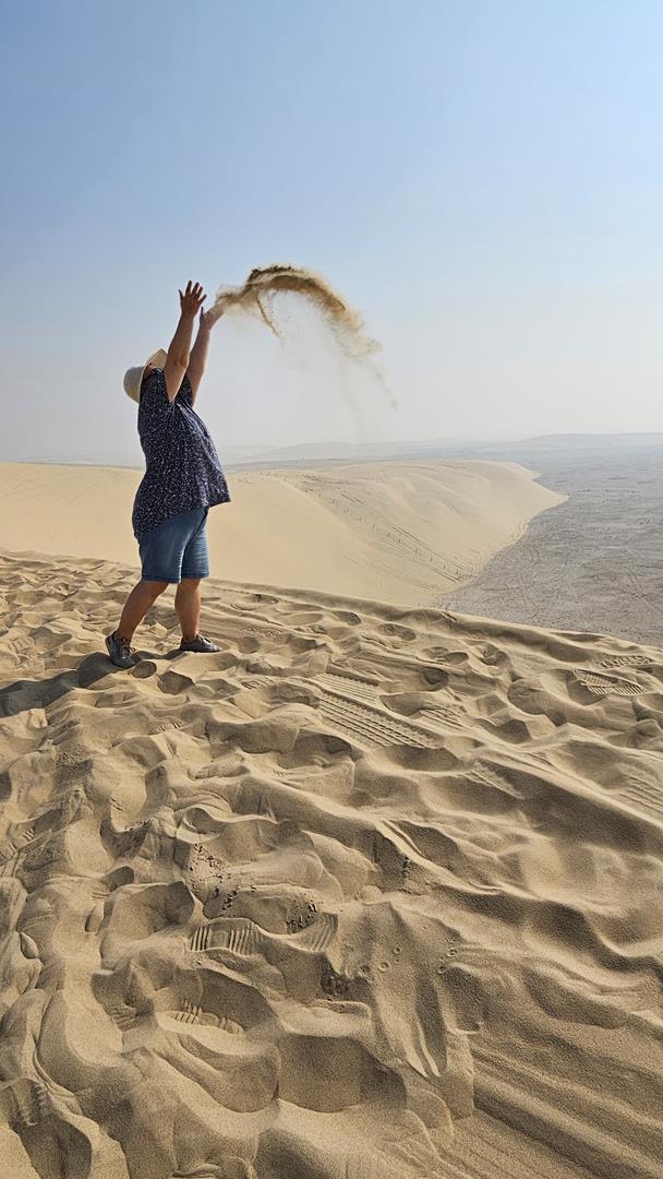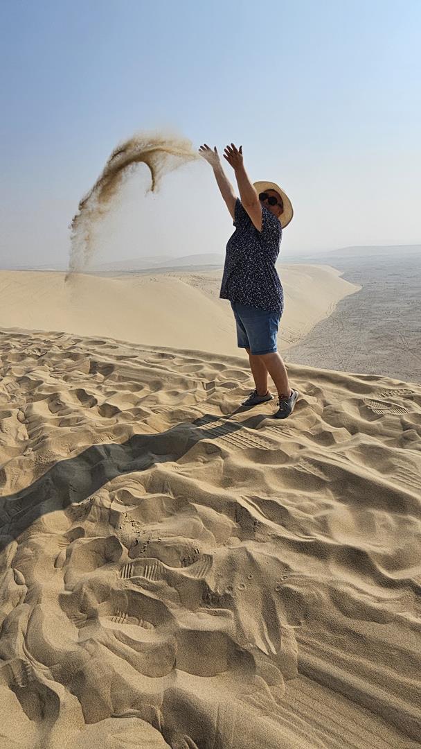 An den „Singenden Dünen“ machen wir einen kurzen Stopp. Angeblich sollen diese Dünen tatsächlich „singen“, also unter bestimmten klimatischen Bedingungen singende Geräusche abgeben. Also, wir können heute nichts hören. Dafür haben wir einen sagenhaften Rundumblick auf die Wüste.