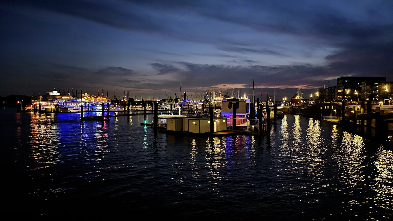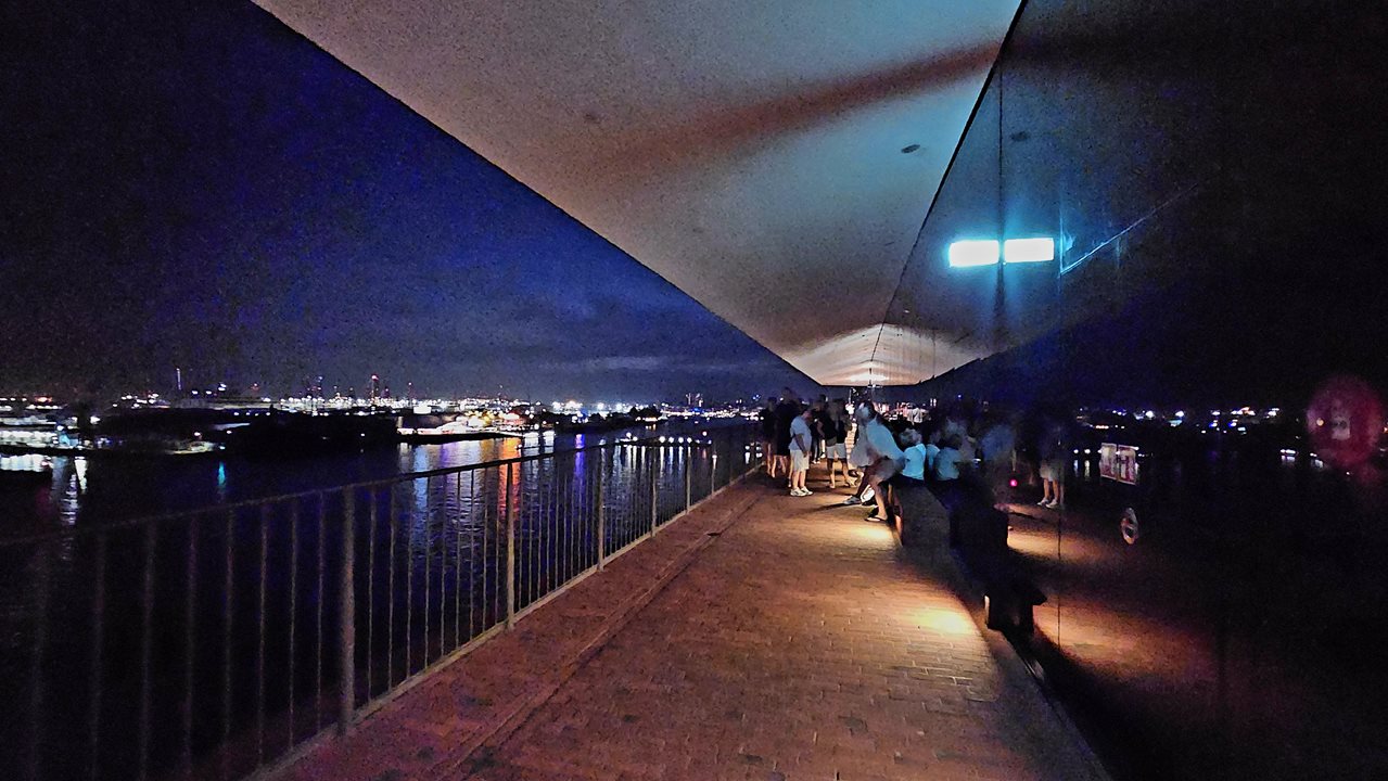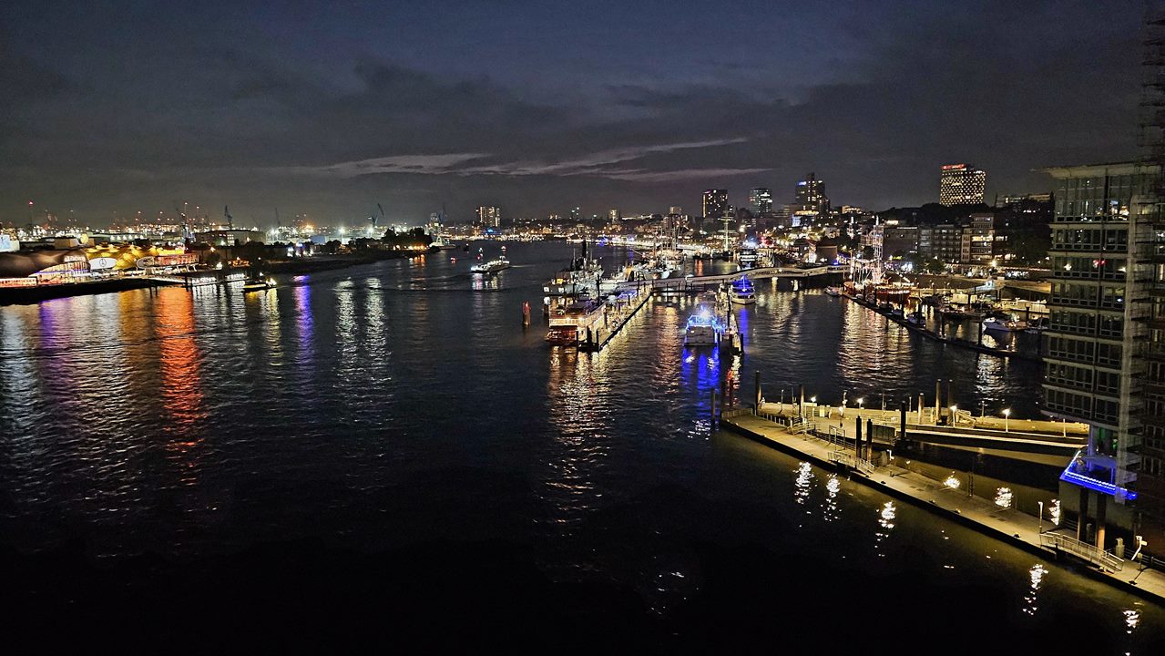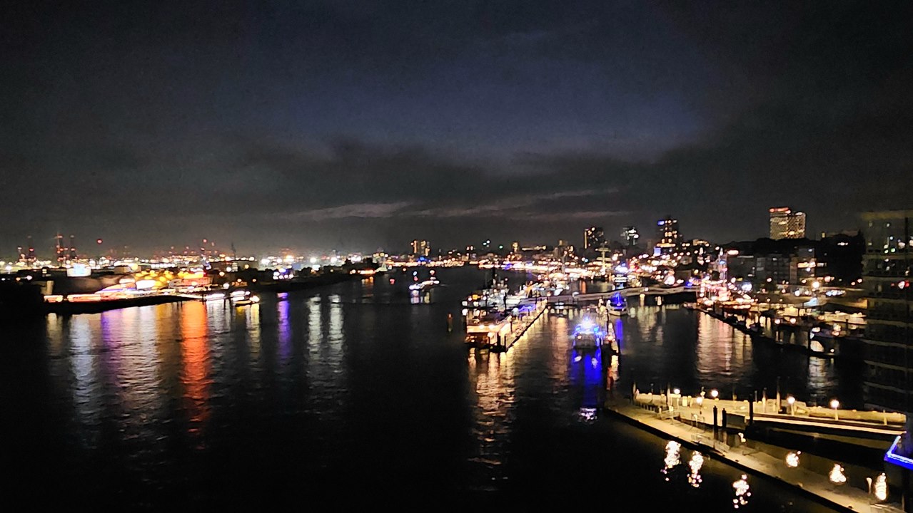 Wir genießen den Ausblick von der Plaza von allen Seiten der Außenplaza. Uns bietet sich ein einzigartiger Blick auf die Landungsbrücken und den Hafen, der Himmel ist in tiefes Blau getaucht und die Lichter der Stadt leuchten. Der Hamburger Hafen ist besonders in den Abendstunden ein beeindruckendes Spektakel. Die zahlreichen Lichter der Schiffe, Kräne und Hafenanlagen schaffen eine lebendige, fast magische Atmosphäre,