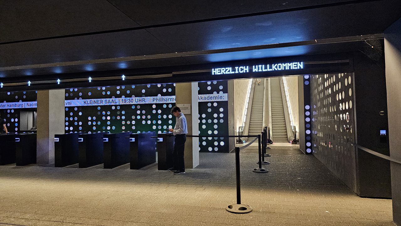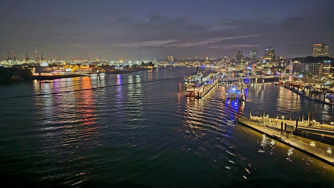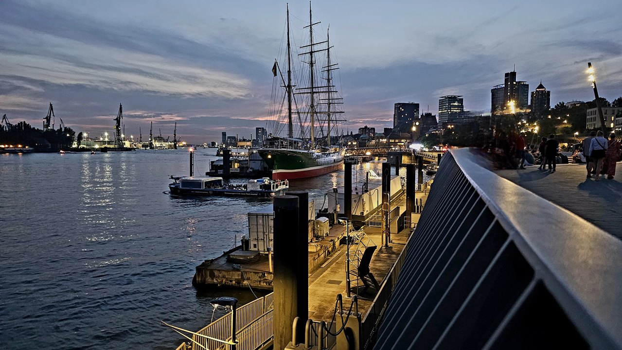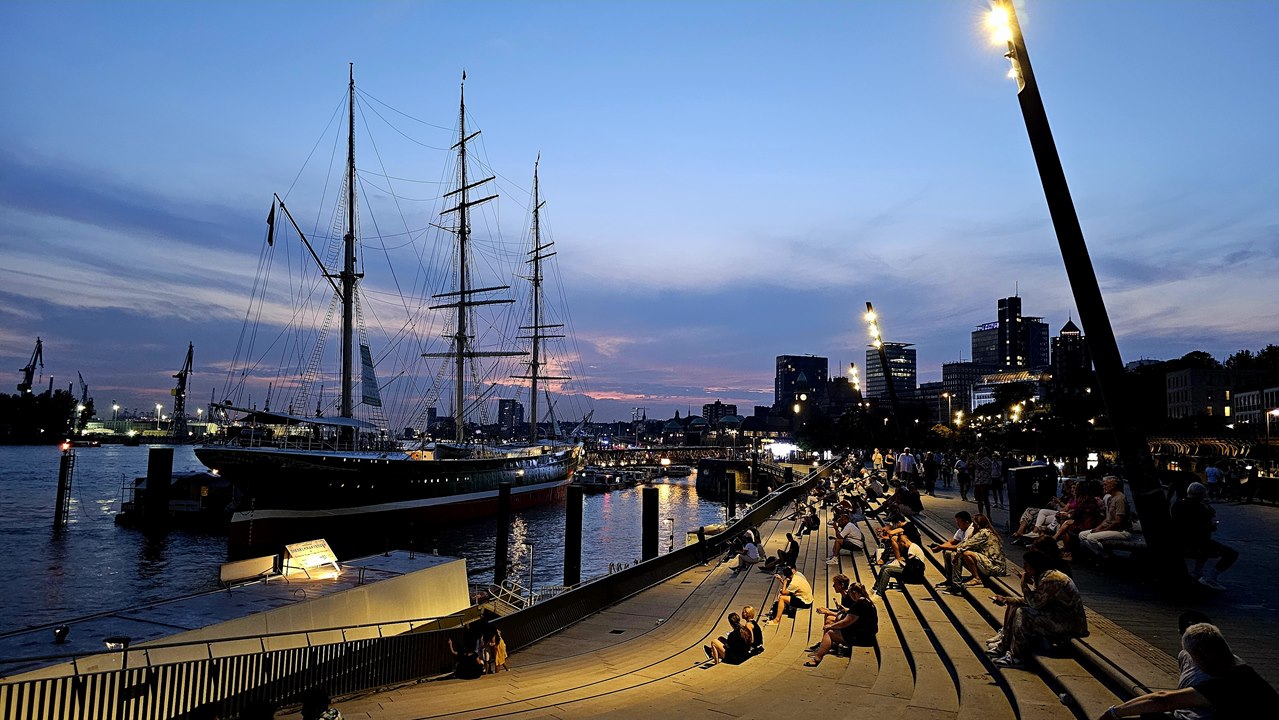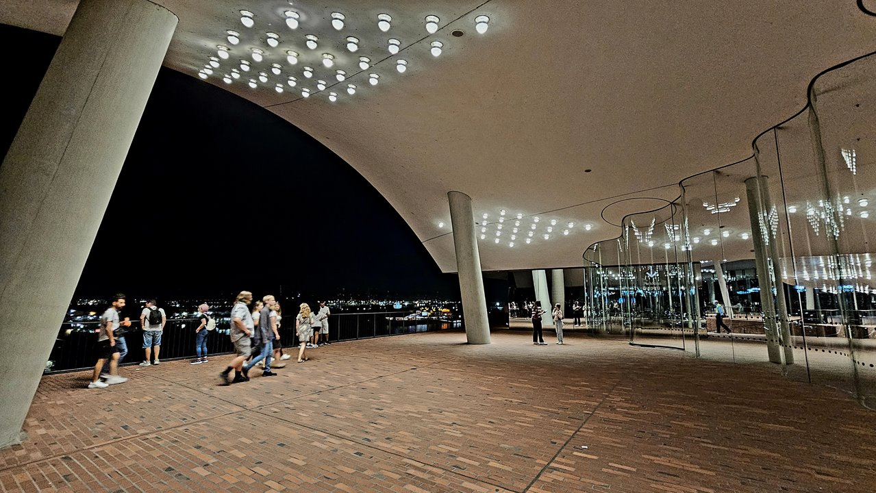 Wir genießen den Ausblick von der Plaza von allen Seiten der Außenplaza. Uns bietet sich ein einzigartiger Blick auf die Landungsbrücken und den Hafen, der Himmel ist in tiefes Blau getaucht und die Lichter der Stadt leuchten. Der Hamburger Hafen ist besonders in den Abendstunden ein beeindruckendes Spektakel. Die zahlreichen Lichter der Schiffe, Kräne und Hafenanlagen schaffen eine lebendige, fast magische Atmosphäre,