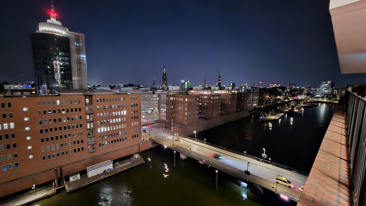 Zur anderen Seite hin sehen wir die Speicherstadt, den weltweit größte zusammenhängende Komplex von Lagerhallen. Die blaue Stunde verleiht der Szenerie eine fast mystische Ruhe. Ein faszinierendes Zusammenspiel von Licht und Schatten 🙂