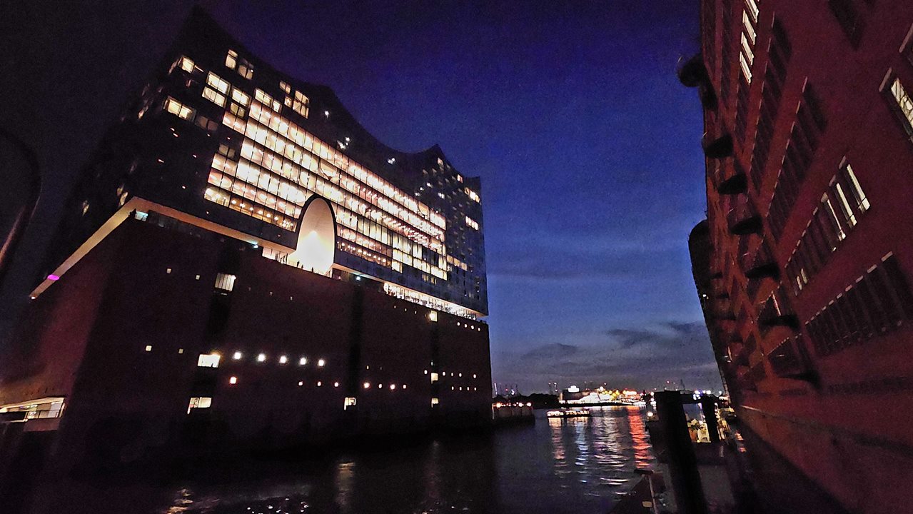 Am Ende der Landungsbrücken steht ein weiteres Wahrzeichen von Hamburg: Die Elbphilharmonie oder auch liebevoll „Elphie“ genannt. Diese ist wegen ihrer endlosen Baugeschichte weit über die Stadtgrenzen hinaus bekannt, aber auch wegen ihrer einzigartigen Architektur. Und die Elphie ist jetzt unser Ziel. Die markante Glasfassade reflektiert die Lichter der Umgebung und fügt sich harmonisch ins nächtliche Stadtbild ein.