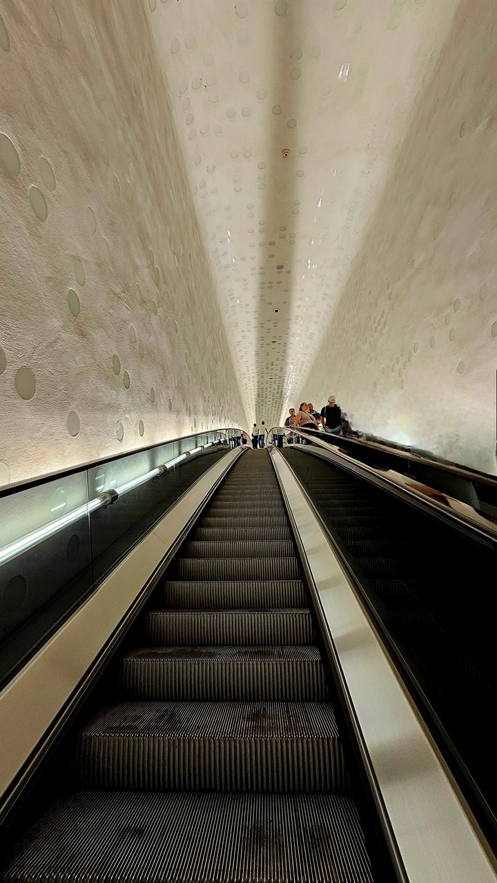 Es ist jetzt 20.45 Uhr und wir sind mitten in der „blauen Stunde“, also perfekt für tolle Fotos kurz nach Sonnenuntergang. Vom Eingang führt uns eine 82 Meter lange, gebogene Rolltreppe aufwärts durch den Speicher. In 2:30 Minuten erreichen wir die Plaza. Schon diese Rolltreppe ist ein kleines Highlight.