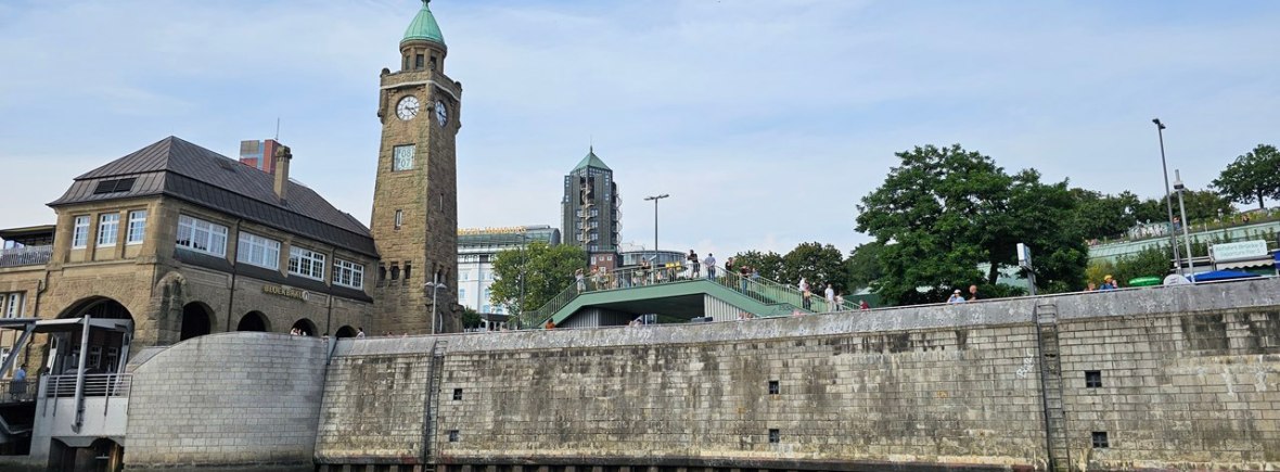 Die Sonne scheint, es ist warm, wir fühlen uns richtig gut. So nach der langen Fahrt tut es gut, ein wenig zu laufen. Und ein Besuch der Landungsbrücken gehört definitiv dazu, wenn man Hamburg besucht. Zwischen Elbphilharmonie und Fischmarkt erstreckt sich diese Promenade mit allerlei Sehenswürdigkeiten und tollen Ausblicken auf den Hamburger Hafen. Wir flanieren entspannt über die Landungsbrücken. Inzwischen ist es ganz schön heiß geworden, richtig viel Schatten gibt es hier nicht. Das schreit nach einer kleinen Pause mit etwas Kühlem zu trinken 🙂
