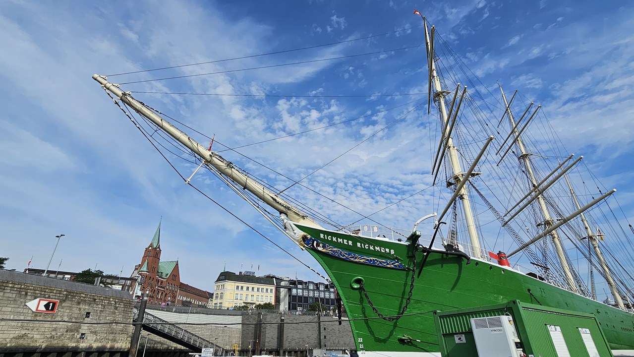 Beim Frachtensegler Rickmer Rickmers – auch ein Wahrzeichen von Hamburg, diesmal das schwimmende Wahrzeichen 😉 – finden wir ein nettes Café. Wir geben Juli und Greg unseren Standort durch und die beiden stoßen kurz danach zu uns. Und dann genießen wir ein leckeres Schweden-Eis mit Apfelmus 🙂 Sehr lecker.