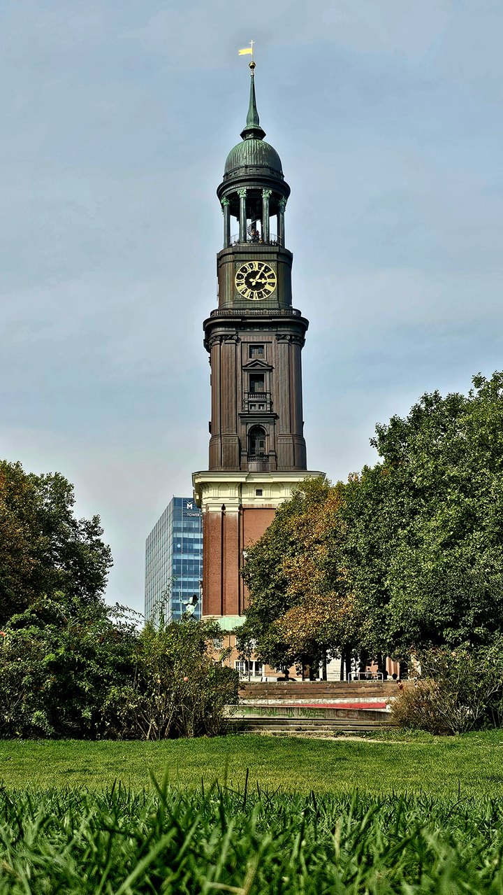 Gegen 15 Uhr ziehen wir los und starten unsere Erkundungstour von Hamburg. Direkt neben dem Hotel steht die St. Michaelis Kirche, auch umgangssprachlich „Michel“ genannt. Die Kirche wurde 1647 gebaut und gehört zu den bedeutendsten historischen Stätten der Stadt. Sie gilt als das Wahrzeichen von Hamburg. Wir schlendern am Michel vorbei, durch den angrenzenden Park und beobachten gutgelaunte Menschen, die hier auf bunten Decken in der Sonne sitzen. Gemütlich spazieren wir weiter Richtung Landungsbrücken.