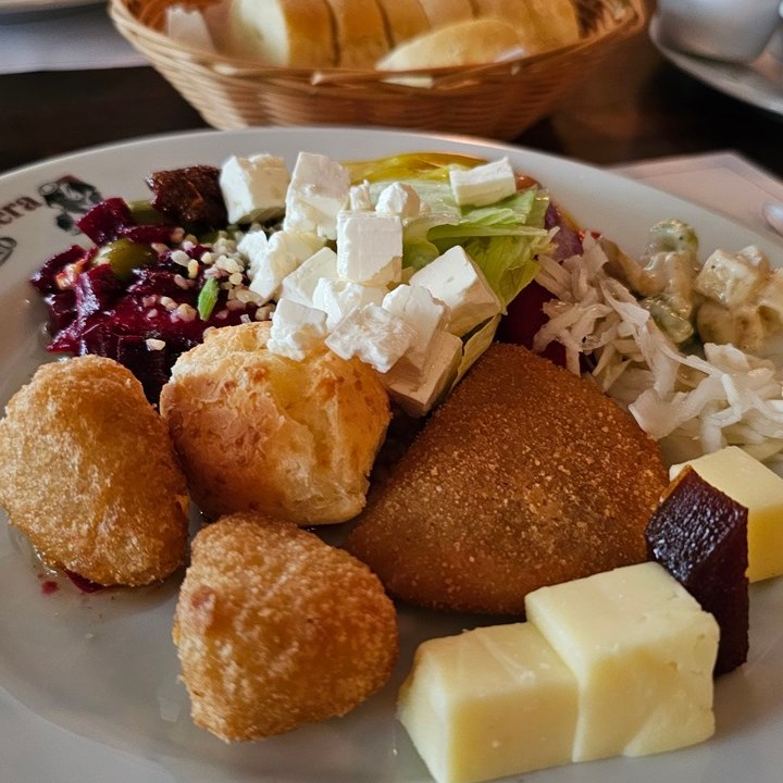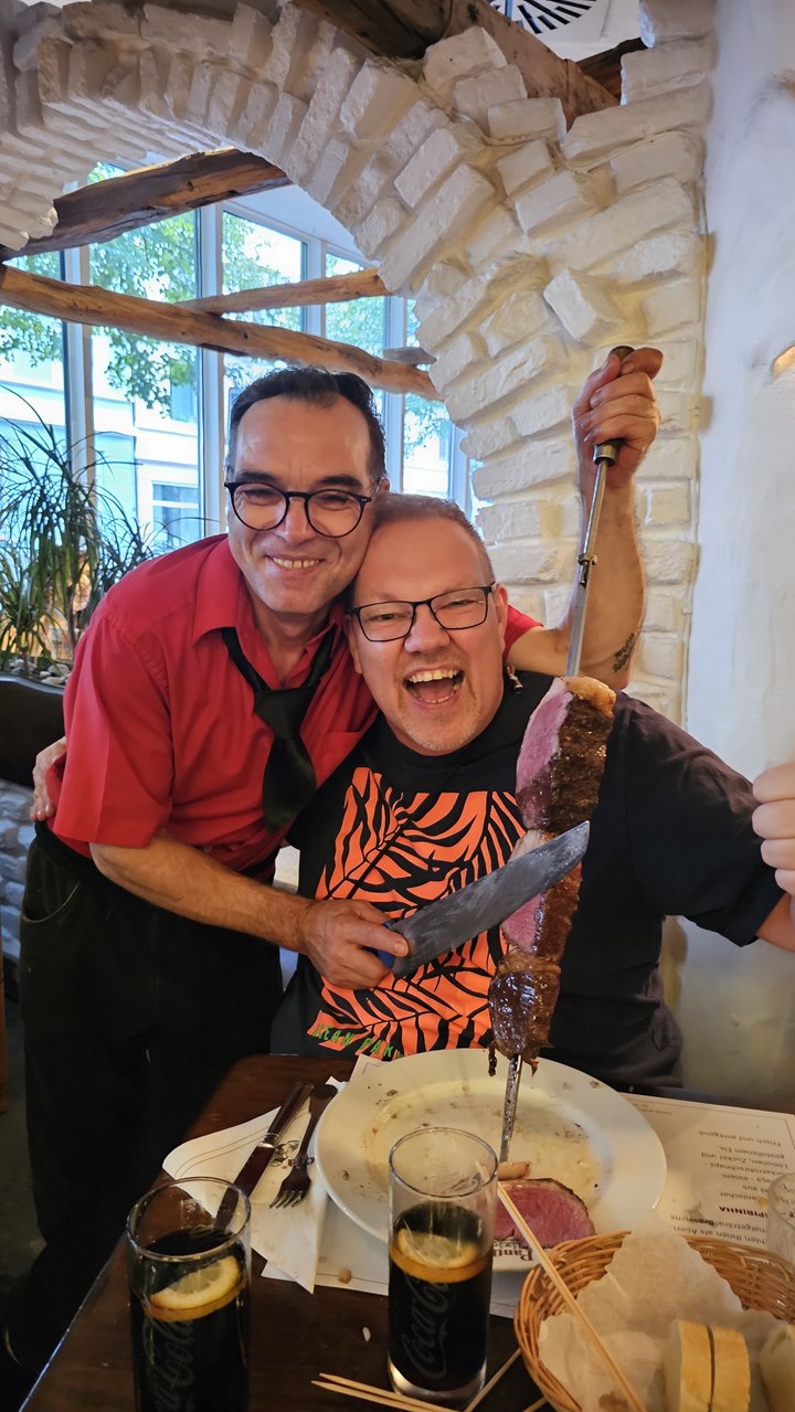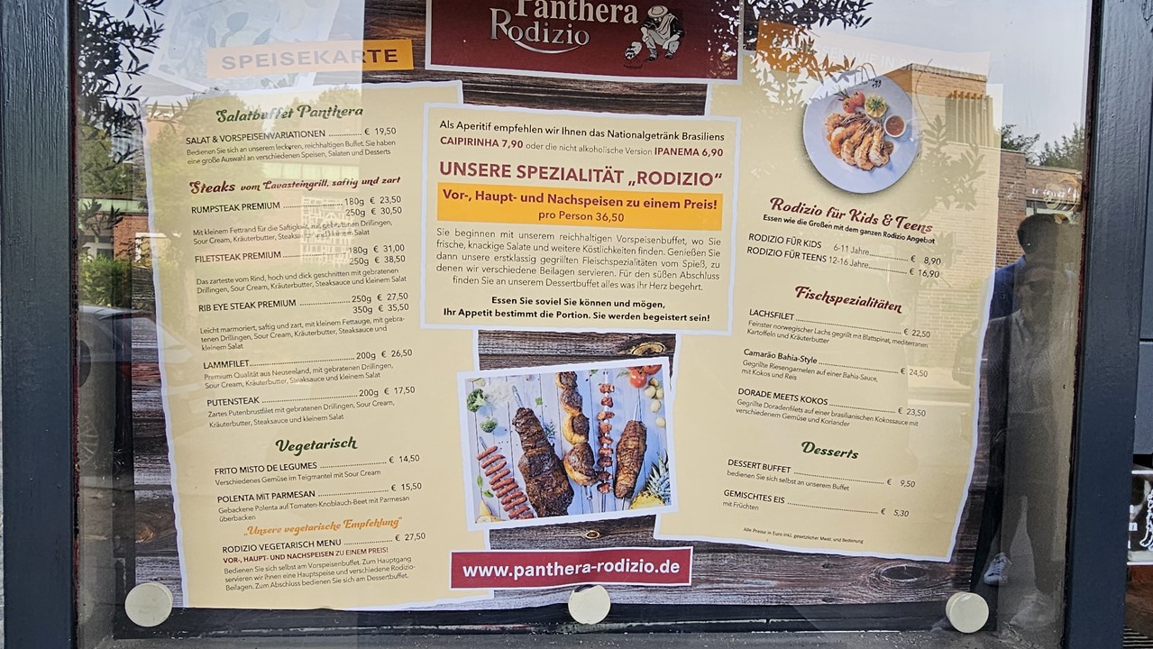 Wir entscheiden uns alle für das Rodizio, die Spezialität des Hauses. Ein Rodizio besteht aus frisch gegrillten Fleisch- und Wurstspießen, die am Tisch aufgeschnitten und direkt auf den Teller gelegt werden. Und aus zubereiteten Beilagen und Spezialitäten, die immer wiederkehrend an den Tisch gebracht werden. Und das alles so lange, bis man satt ist 🙂