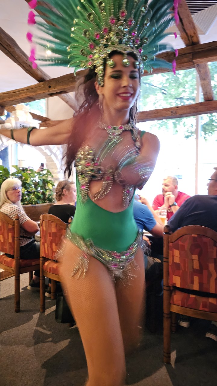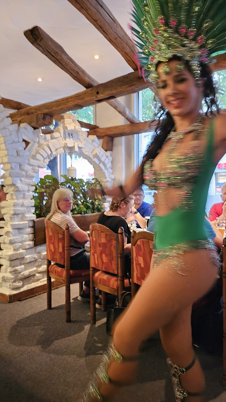 Zwischendurch wird Entertainment mit südamerikanischem Flair geboten. Eine brasilianische Band spielt feurigen Samba und Bossa Nova und temperamentvolle Tänzerinnen in knappen Kostümen und kunstvollem Kopfschmuck schwenken in schnellem Rhythmus ihre Hüften dazu. Wir haben richtig viel Spaß dabei. Tolles Essen, tolles Entertainment, ein rundum gelungener Abend 🙂