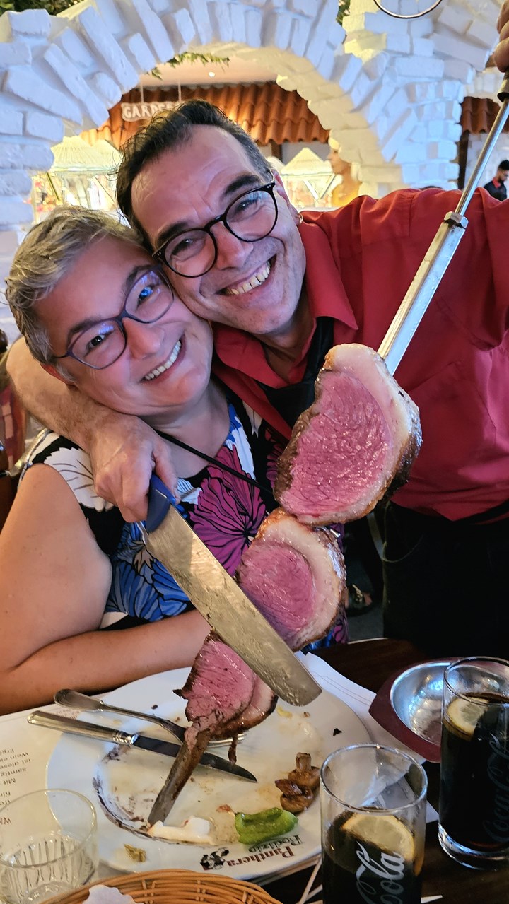 Und dann kommt die Hauptspeise, der absolute Knaller: Kellner wandern mit Fleischspießen von Tisch zu Tisch und schneiden soviel auf wie man möchte. Es gibt zartes Rindfleisch, Knoblauchschinken und Tafelspitz, saftiges Hüftsteak, Burgunderbraten, Lammkeule, Chorizo, gefüllte Geflügelrouladen und noch mehr. Dazu wird eine ganze Palette an Beilagen serviert: Reis und schwarze Bohnen, Broccoli, Pilze, Paprika und Pommes. Und das alles sooft man möchte.